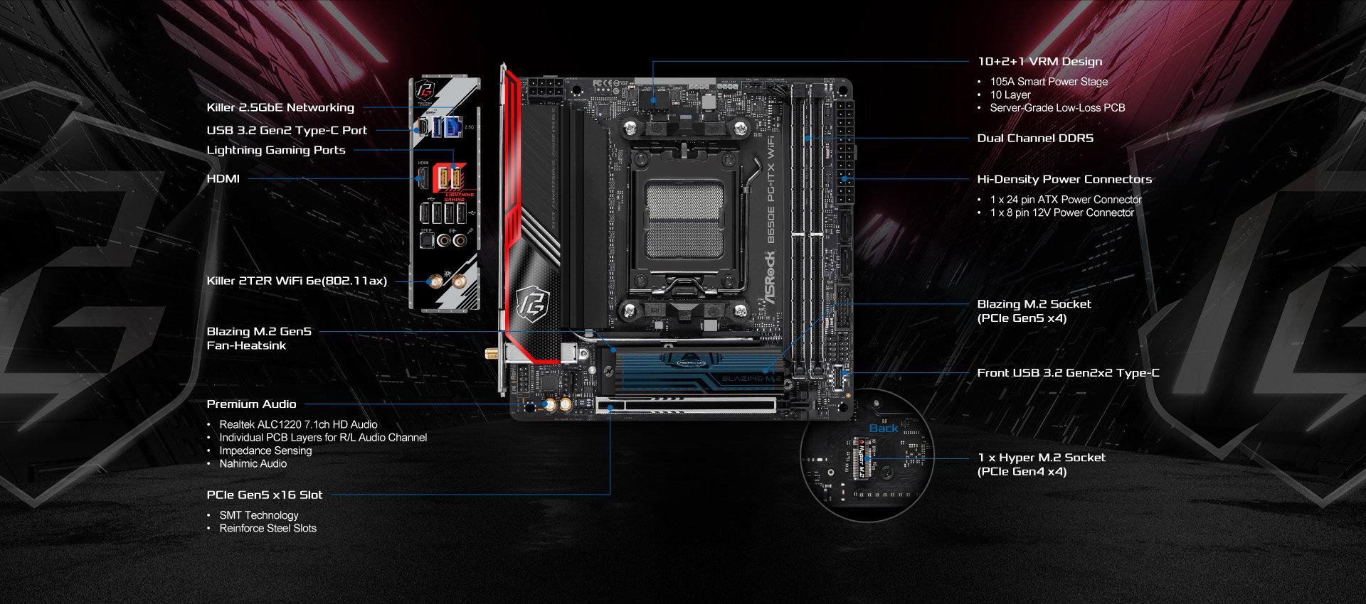 Superb Productivity - PCIe Gen5 (Graphics, M.2) - ASRock Blazing M.2 Gen5 Fan Heatsink - Dual Channel DDR5 Rock-Solid Durability - Server-Grade Low-Loss PCB - 10+2+1 Power Phase, 105A SPS for VCore - Flexible Integrated I/O Shield Ultrafast Gaming - Killer 2.5G LAN, Killer 802.11ax Wi-Fi 6E Module - Killer DoubleShot™ Pro - ASRock Lightning Gaming Ports EZ Update - ASRock Auto Driver Installer |