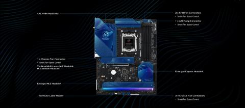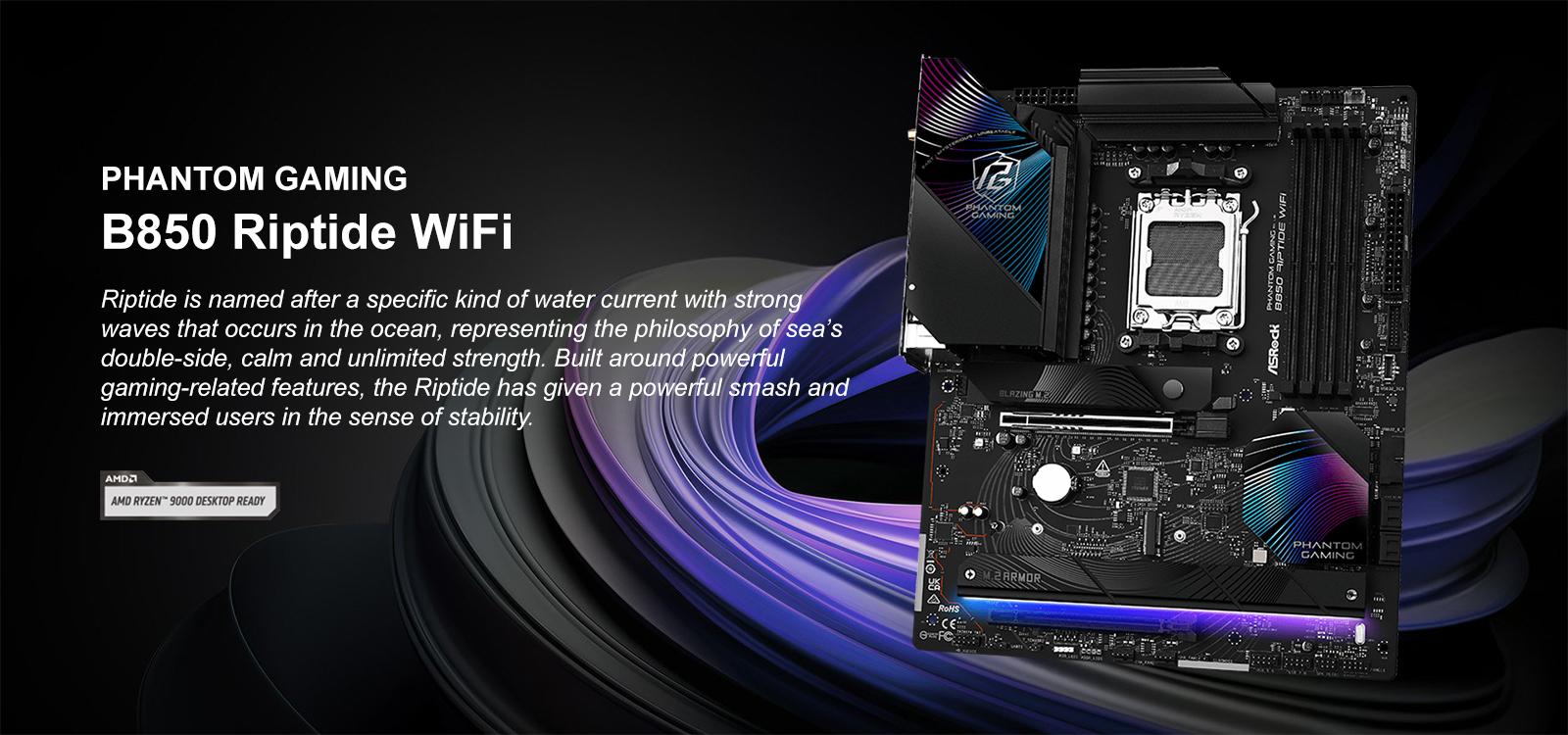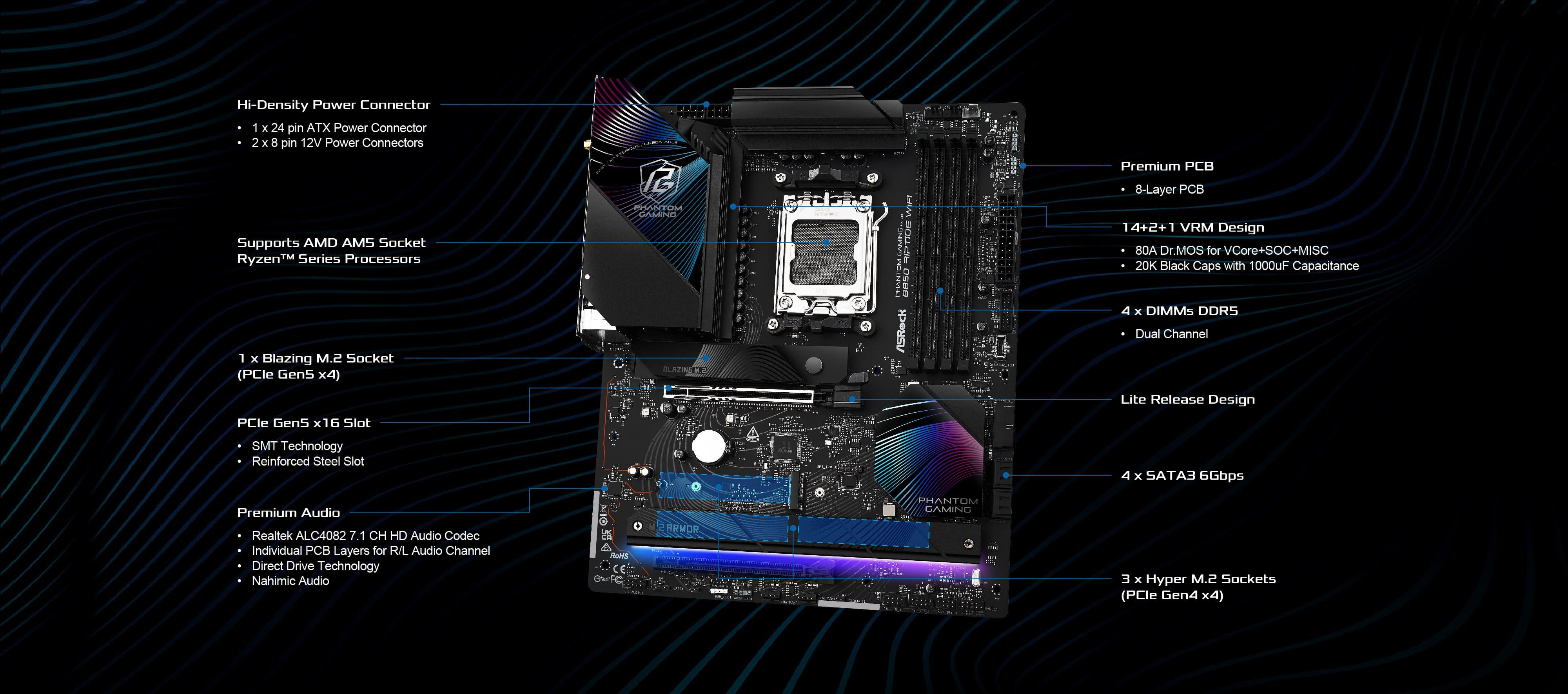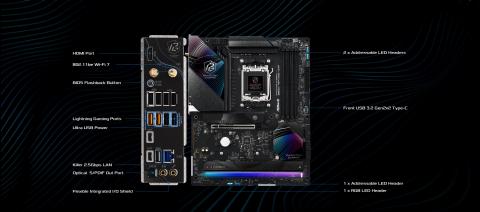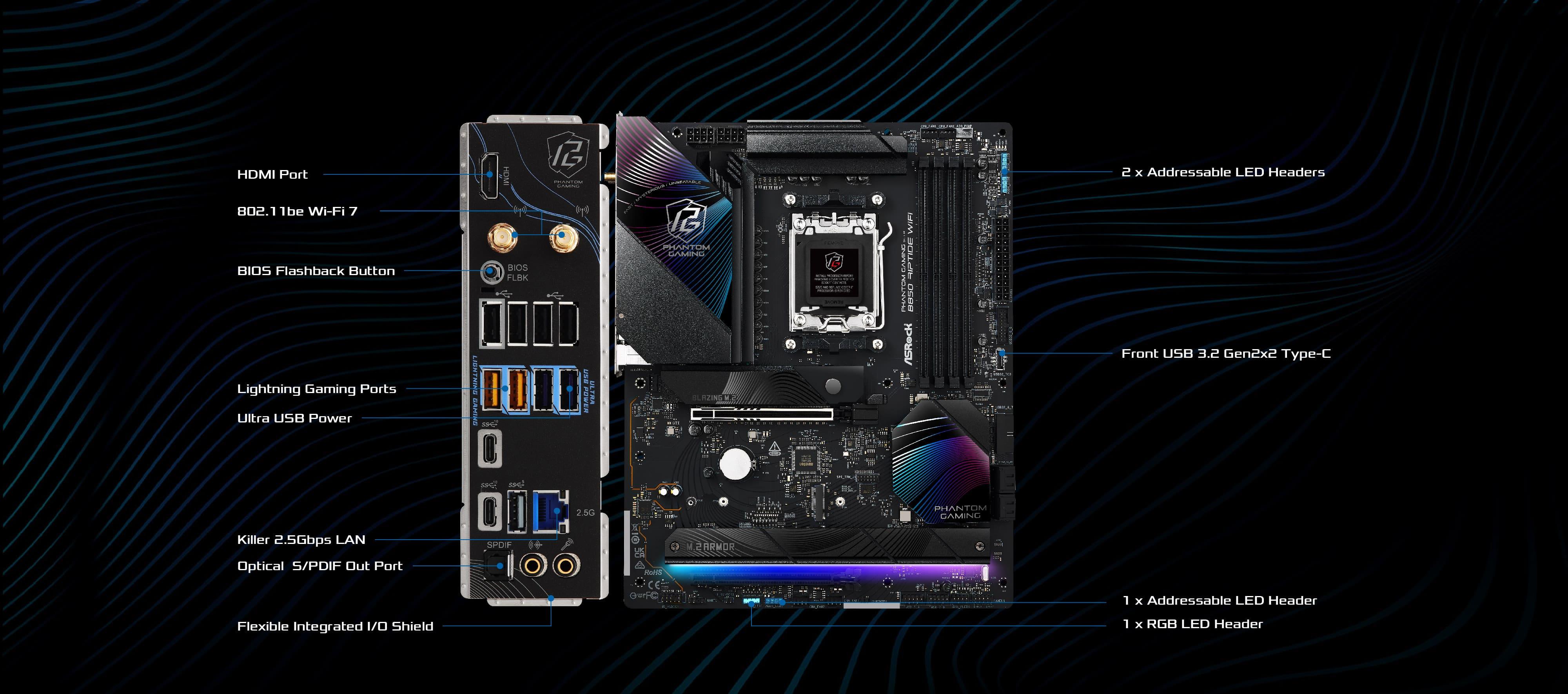 | Unique Feature | Superb Productivity - PCIe Gen5 (Graphics, M.2) - Dual Channel DDR5 Rock-Solid Durability - 14+2+1 Power Phase, 80A Dr.MOS for VCore+SOC+MISC with Enlarged Heatsink Armor - Flexible Integrated I/O Shield - 20K Long-lasting Black Caps (high quality and conductive polymer capacitors) Ultrafast Gaming - Killer 2.5G LAN, 802.11be Wi-Fi 7 Module - ASRock Lightning Gaming Ports EZ Update - BIOS Flashback Button - ASRock Auto Driver Installer EZ Troubleshooter - ASRock Post Status Checker |