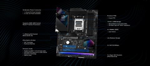 | CPU | - Supports AMD Socket AM5 Ryzen 9000, 8000 and 7000 Series Processors* *The availability of expansion slots may vary by CPU. Please refer to PCIe/M.2 Bandwidth Table for details.