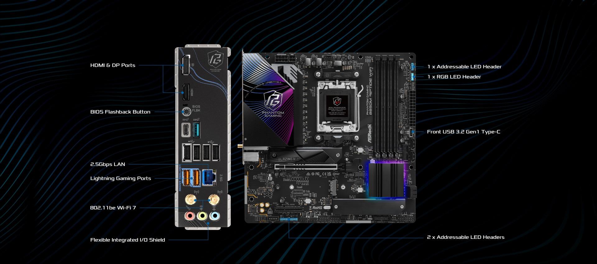 | Unique Feature | Superb Productivity - PCIe Gen5 (Graphics, M.2) - Dual Channel DDR5 Rock-Solid Durability - 12+2+1 Power Phase, Dr.MOS for VCore+SOC+MISC with Enlarged Heatsink Armor - Flexible Integrated I/O Shield - 20K Long-lasting Black Caps (high quality and conductive polymer capacitors) Ultrafast Gaming - 2.5G LAN, 802.11be Wi-Fi 7 Module EZ Update - BIOS Flashback Button - ASRock Auto Driver Installer EZ Troubleshooter - ASRock Post Status Checker |
