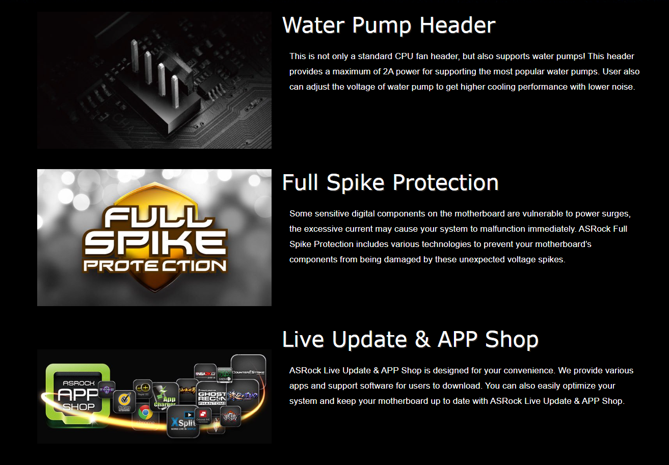 | Software and UEFI | Software - ASRock Motherboard Utility (A-Tuning) UEFI - ASRock EZ Mode - ASRock Full HD UEFI - ASRock My Favorites in UEFI - ASRock Auto Driver Installer - ASRock Instant Flash *These utilities can be downloaded from ASRock Live Update & APP Shop.