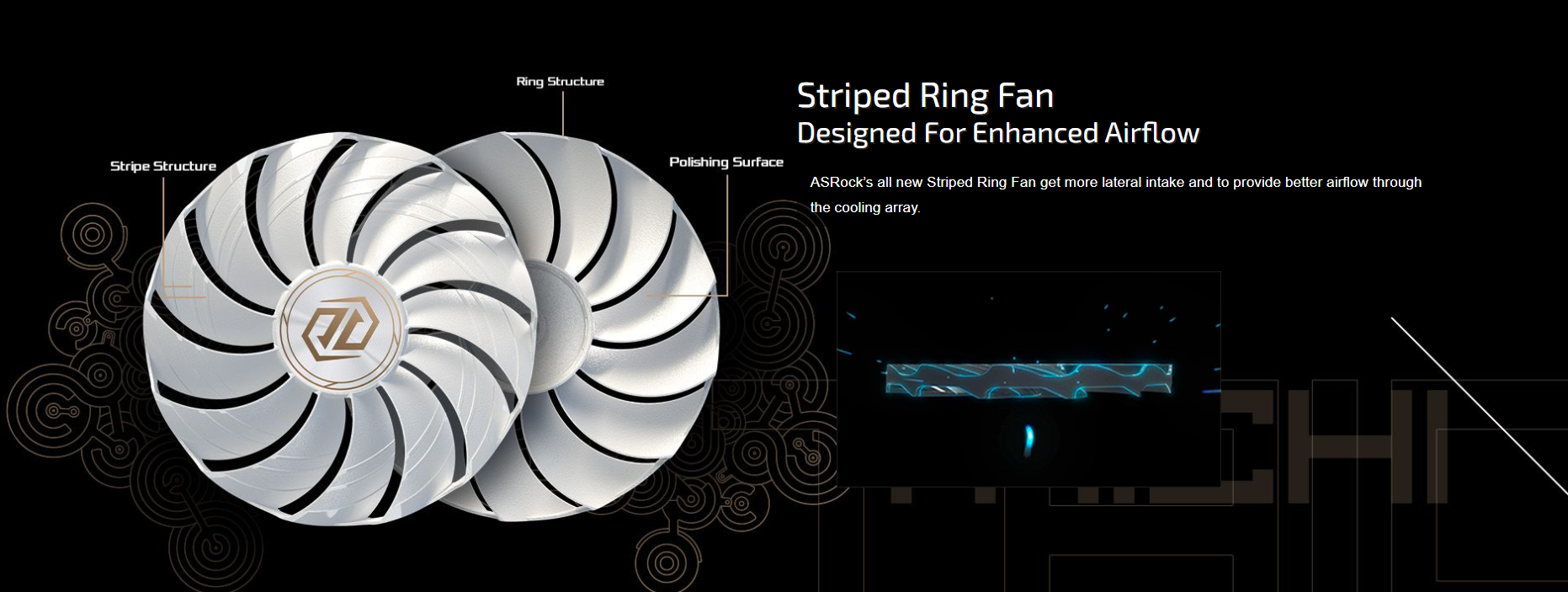 | With a high conductive polymer as the electrolyte, it has a lower equivalent series resistance (ESR) to provide outstanding electrical characteristics. In addition to that, it also has excellence in product operational life, reliability and heat resistance. | Dr.MOS design features the latest SPS (Smart Power Stage) technology. It’s optimized for monitoring current and temperature of each phase, thus delivering smoother and neater power to the GPU with enhanced performance and OC capability. | Compared to traditional chokes, ASRock’s premium 100A power chokes effectively make the saturation current up to three times better, thus providing enhanced and improved Vcore voltage to the graphics card. |
