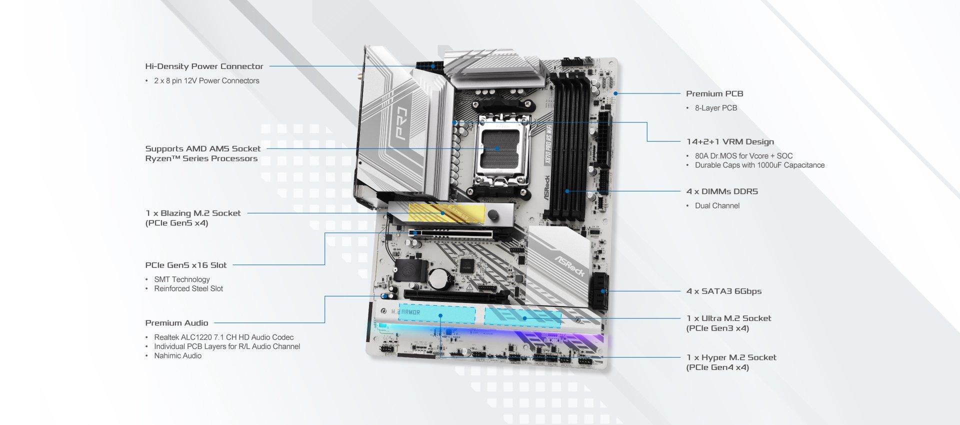 | Unique Feature | Superb Productivity - PCIe Gen5 (Graphics, M.2) - Dual Channel DDR5 - USB4 Type-C Ports (40 Gb/s) Rock-Solid Durability - 14+2+1 Power Phase, 80A Dr.MOS for VCore+SOC+MISC with Enlarged Heatsink Armor - Flexible Integrated I/O Shield Ultrafast Connectivity - 2.5G LAN, 802.11be Wi-Fi 7 Module EZ Update - BIOS Flashback Button - ASRock Auto Driver Installer EZ Troubleshooter - ASRock Post Status Checker |