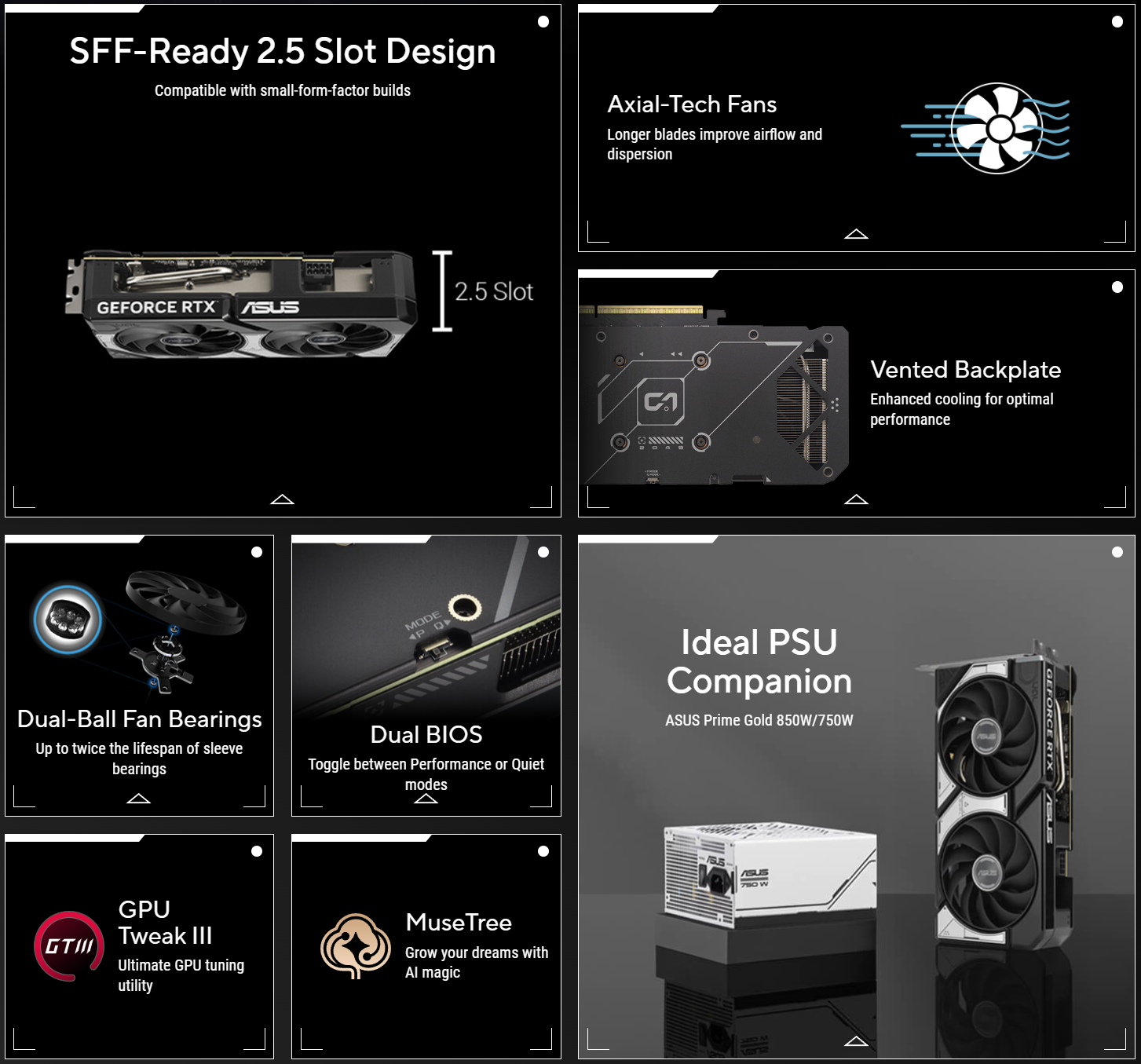 ASUS Dual GeForce RTX 5060 Ti combines powerful thermal performance with broad compatibility. Advanced cooling solutions from flagship graphics cards — including two Axial-tech fans for optimizing airflow to the heatsink. Designed in a compact 2.5-slot form factor, delivering more power in less space. These enhancements make ASUS Dual the perfect choice for gamers who want heavyweight graphics performance in a compact build.