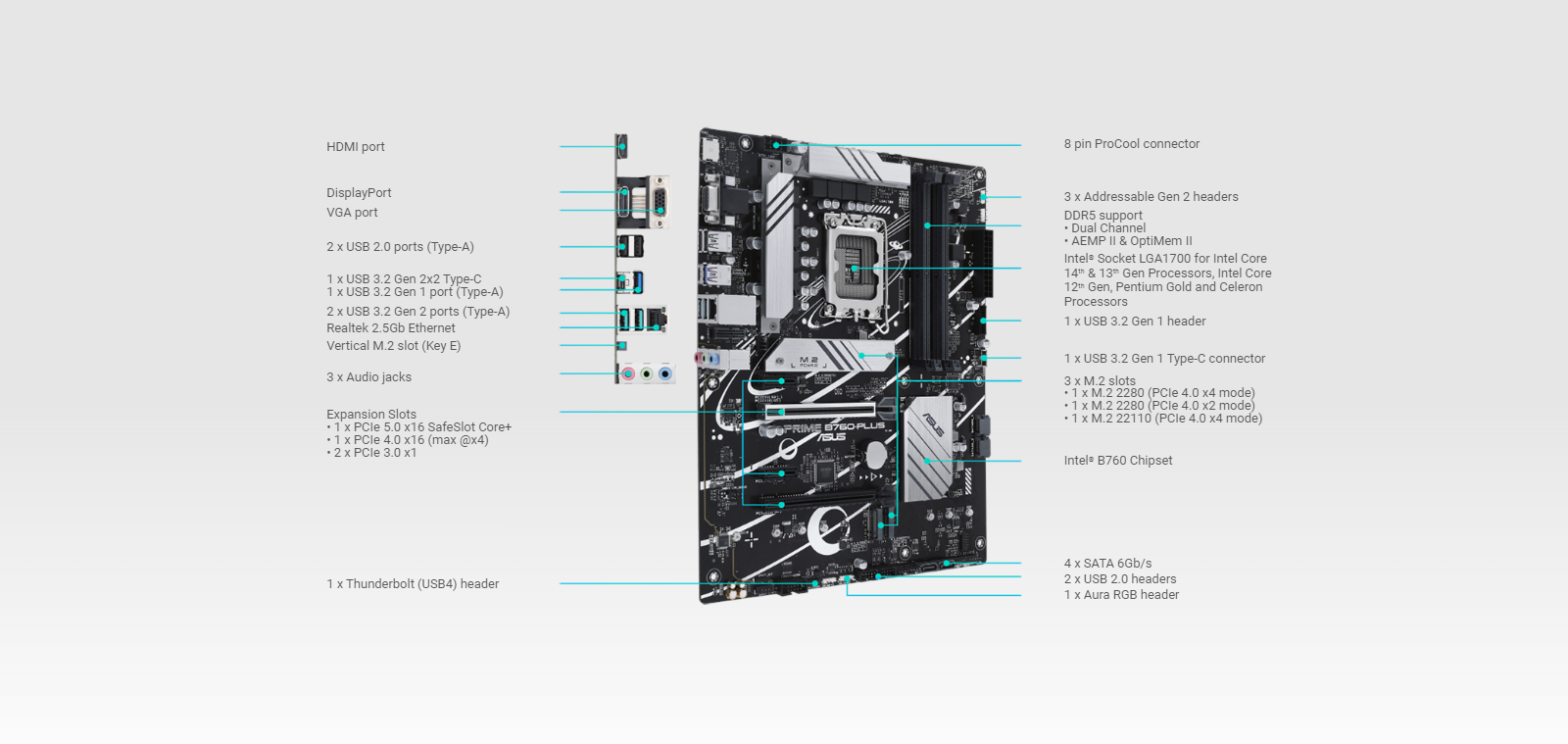 | Expansion Slots | Intel Core Processors (14th & 13th & 12th Gen) 1 x PCIe 5.0 x16 slot Intel B760 Chipset 1 x PCIe 4.0 x16 slot (supports x4 mode) 2 x PCIe 3.0 x1 slots Note: To ensure compatibility of the device installed, please refer to https://www.asus.com/support/ for the list of supported peripherals. |
