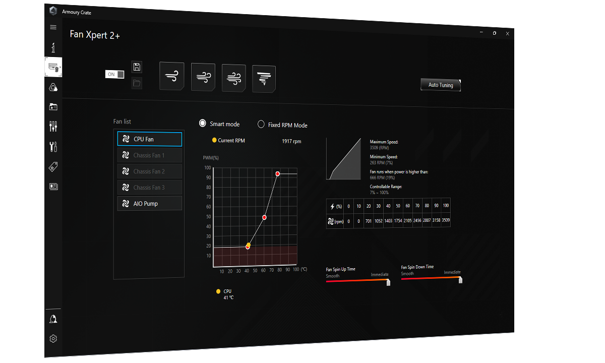 ASUS Fan Xpert 2+ software provides comprehensive control over fans and all-in-one (AIO) coolers. Whether cooling with air or water, an Auto-Tuning mode intelligently configures all parameters with a single click. There’s also an Extreme Quiet mode that reduces chassis fan speeds to below the default minimum to keep your system whisper-quiet when performing light tasks. Fans and AIO coolers can also be controlled via the UEFI BIOS.
