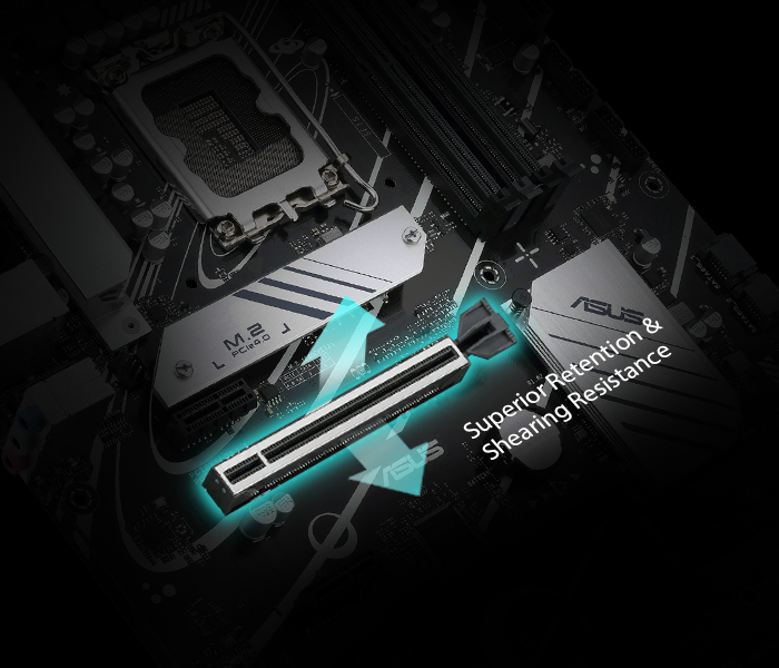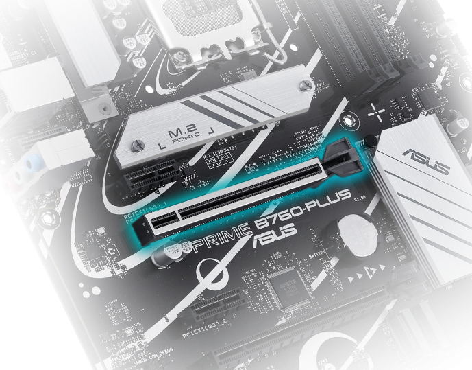 PRIME B760-PLUS D4 offers a total of three M.2 slots that support data-transfer speeds of up to 64 Gbps via PCIe 4.0, enabling quicker boot-up and app load times with OS or application drives.