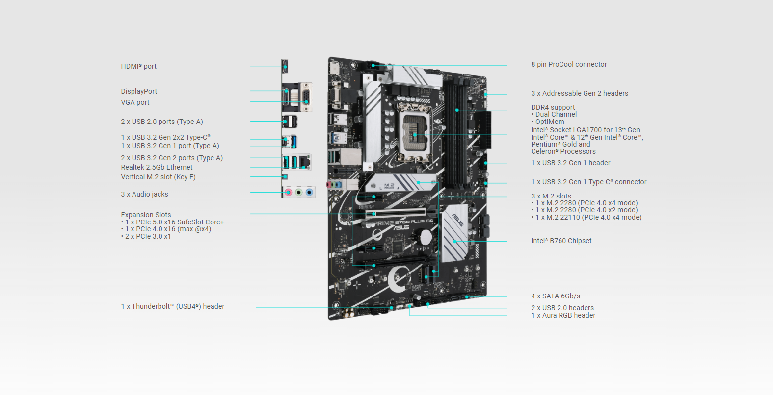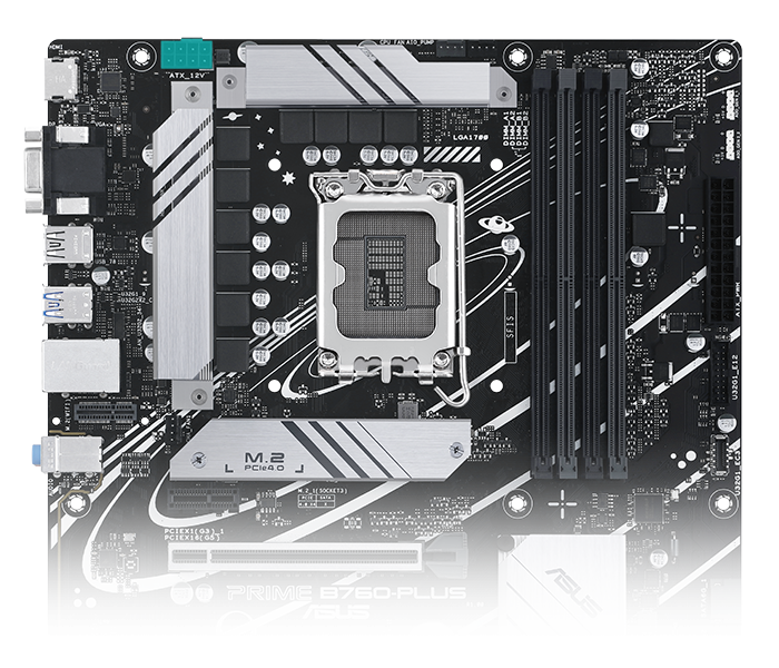 The PRIME B760-PLUS D4 motherboard is built to handle the high core counts and bandwidth demands of 13th Gen Intel Core Processors. ASUS B760 motherboard provides all the fundamentals to boost daily productivity, so your system will be ready for action with stable power, intuitive cooling and flexible data transfer options.