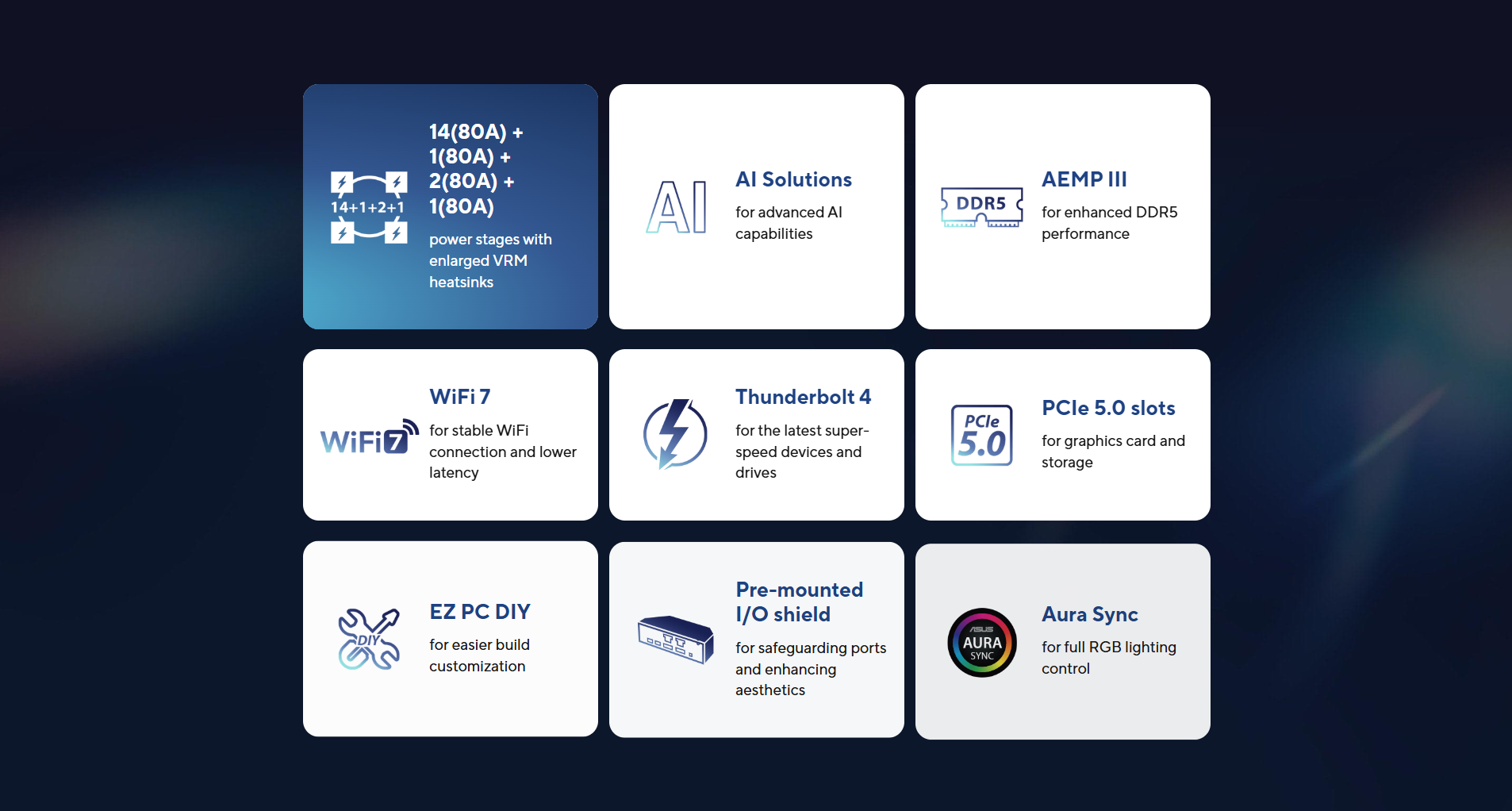 | Software Features | ASUS Exclusive Software Armoury Crate - Aura Creator - Aura Sync - Fan Xpert 4 (with AI Cooling II) - Power Saving ASUS AI Advisor ASUS DriverHub ASUS GlideX ASUS CPU-Z TurboV Core Norton 360 Deluxe (60 Days Free Trial) WinRAR (40 Days Free Trial) UEFI BIOS ASUS EZ DIY - ASUS CrashFree BIOS 3 - ASUS EZ Flash - ASUS UEFI BIOS EZ Mode - ASUS MyHotkey NPU Boost (Intel K-series Processors only) |