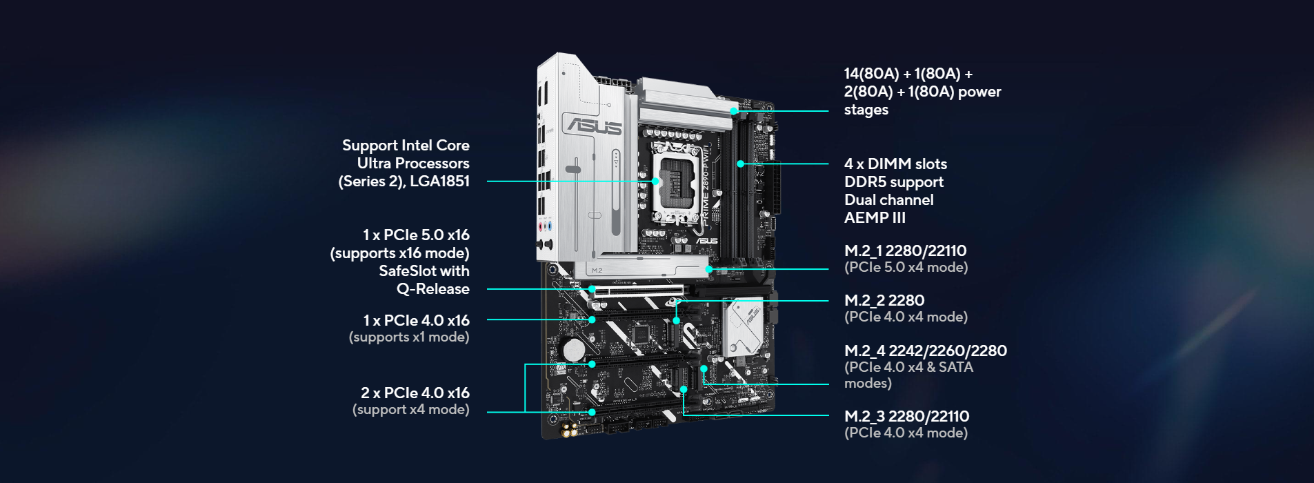 | Expansion Slots | Intel Core Ultra Processors (Series 2)* 1 x PCIe 5.0 x16 slot Intel Z890 Chipset 2 x PCIe 4.0 x16 slots (support x4 mode) 1 x PCIe 4.0 x16 slot (supports x1 mode) * Please check the PCIe bifurcation table on the support site (https://www.asus.com/support/FAQ/1037507/). - To ensure compatibility of the device installed, please refer to https://www.asus.com/support/download-center/ for the list of supported peripherals. |