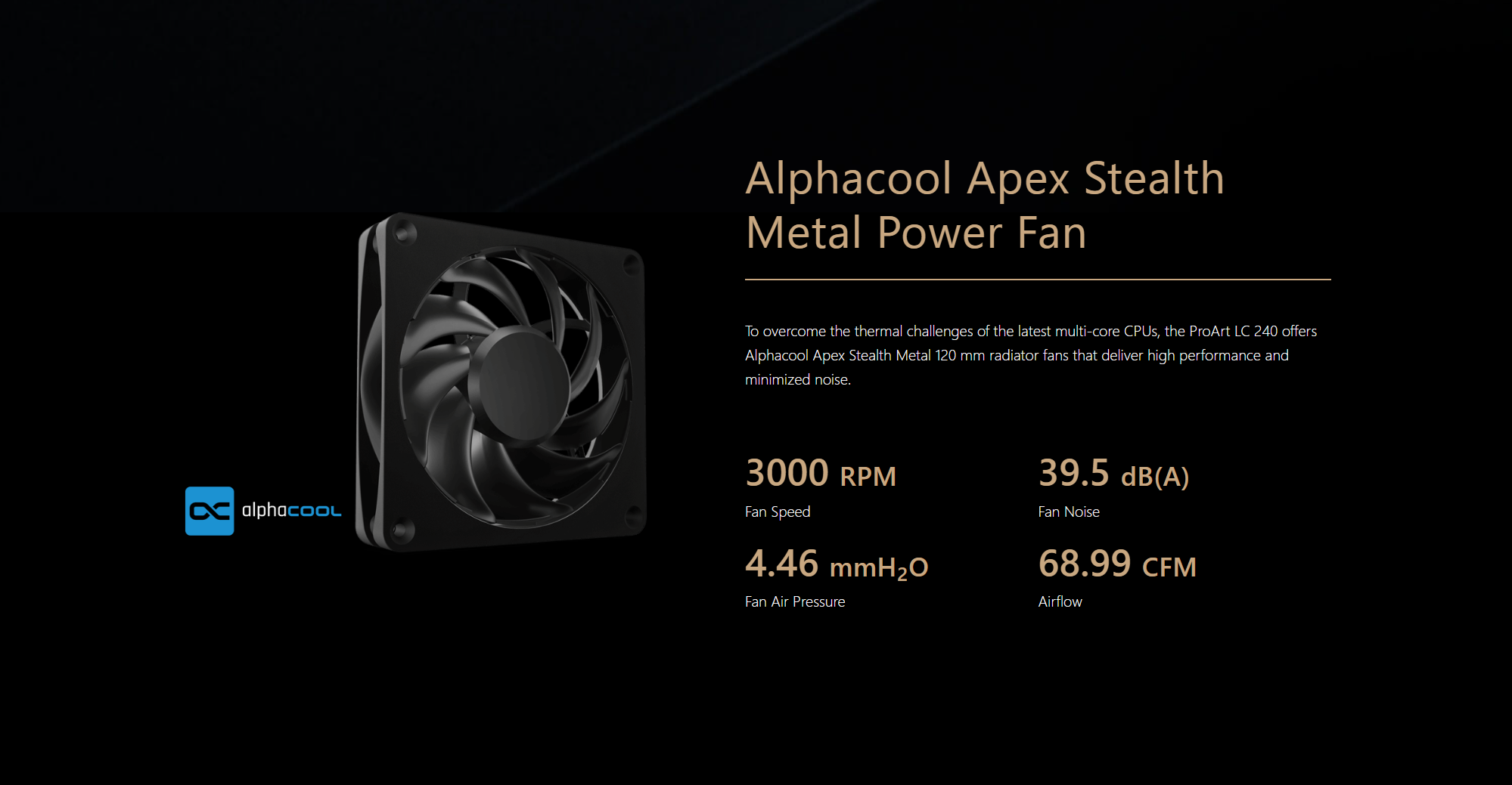 Stealth Metal Power fans, the ProArt LC 240 expertly integrates premium tech into an elegantly understated design. An illuminated