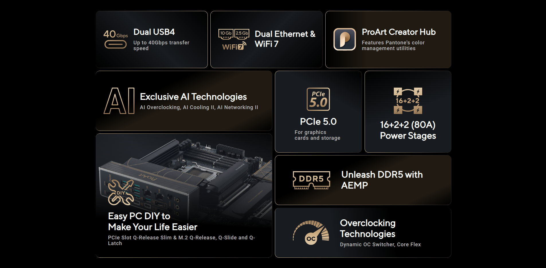 This motherboard manifests a professional, elegant and precise vision for content creators of all kinds, with a style elevated by tone-on-tone