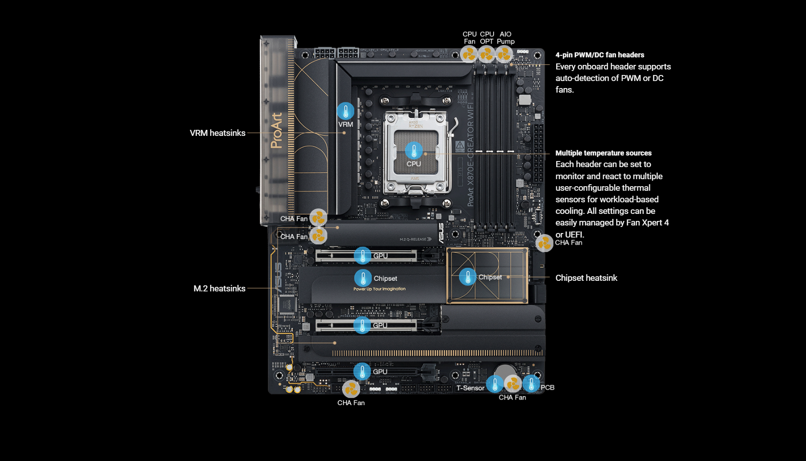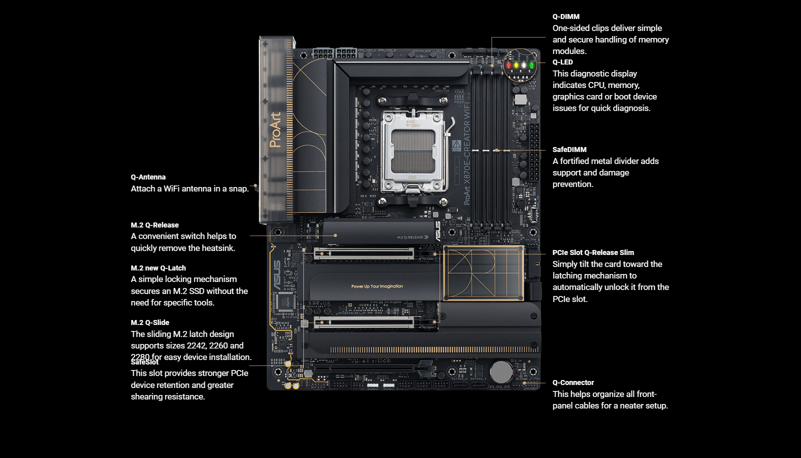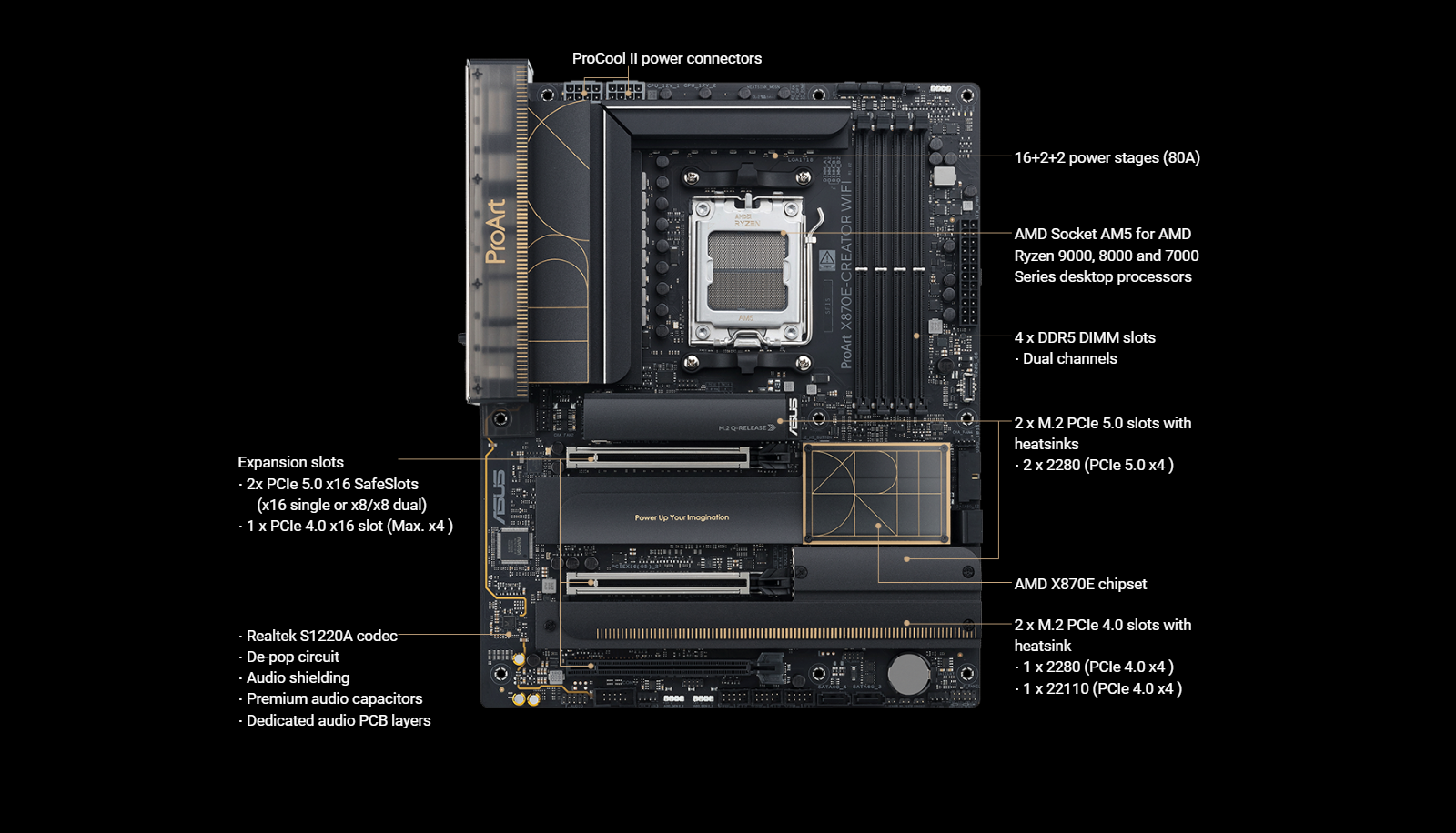 The ProArt X870E-Creator WiFi empowers creators of all levels by maximizing the performance of the latest AMD Ryzen 9000, 8000 and