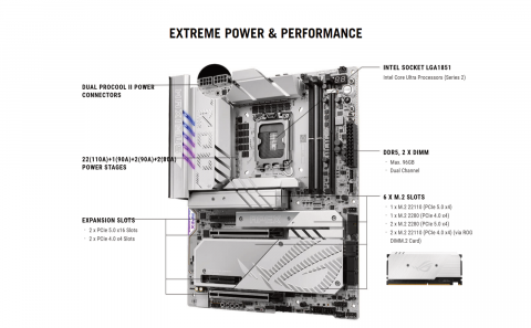 | Storage | Total supports 6 x M.2 slots and 4 x SATA 6Gb/s ports* Support Intel Core Ultra Processors(Series 2) * M.2_1 slot (Key M), type 2242/2260/2280/22110 (supports PCIe 5.0 x4 mode) M.2_2 slot (Key M), type 2242/2260/2280 (supports PCIe 4.0 x4 mode) M.2_3 slot (Key M), type 2242/2260/2280 (supports PCIe 5.0 x4 modes)** M.2_4 slot (Key M), type 2242/2260/2280 (supports PCIe 5.0 x4 modes)** Intel Z890 Chipset DIMM.2_1 slot (Key M) via ROG DIMM.2, type 2230/2242/2260/2280/22110 (supports PCIe 4.0 x4 mode) DIMM.2_2 slot (Key M) via ROG DIMM.2, type 2230/2242/2260/2280/22110 (supports PCIe 4.0 x4 mode) 4 x SATA 6Gb/s ports * Intel Rapid Storage Technology supports PCIe RAID 0/1/5/10, SATA RAID 0/1/5/10, M.2 slot from CPU only supports RAID 0/1/5. **M.2_3 & M.2_4 share bandwidth with PCIEX16(G5)_2. When M.2_3 is enabled, PCIEX16(G5)_1 will run x8 & PCIEX16(G5)_2 will run x4. When M.2_3 & M.2_4 are enabled, PCIEX16(G5)_1 will run x8 & PCIEX16(G5)_2 will disabled. |