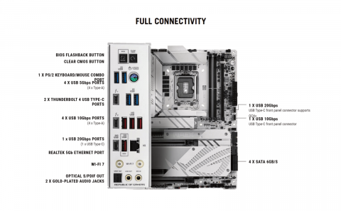| Back Panel I/O Ports | 2 x Thunderbolt 4 ports (USB Type-C) 1 x USB 20Gbps port (1 x USB Type-C) 4 x USB 10Gbps ports (4 x Type-A) 4 x USB 5Gbps ports (4 x Type-A) 1 x Wi-Fi Module 1 x Realtek 5Gb Ethernet port 2 x Gold-plated audio jacks 1 x Optical S/PDIF out port 1 x BIOS FlashBack button 1 x Clear CMOS button 1 x PS/2 keyboard/mouse combo port |