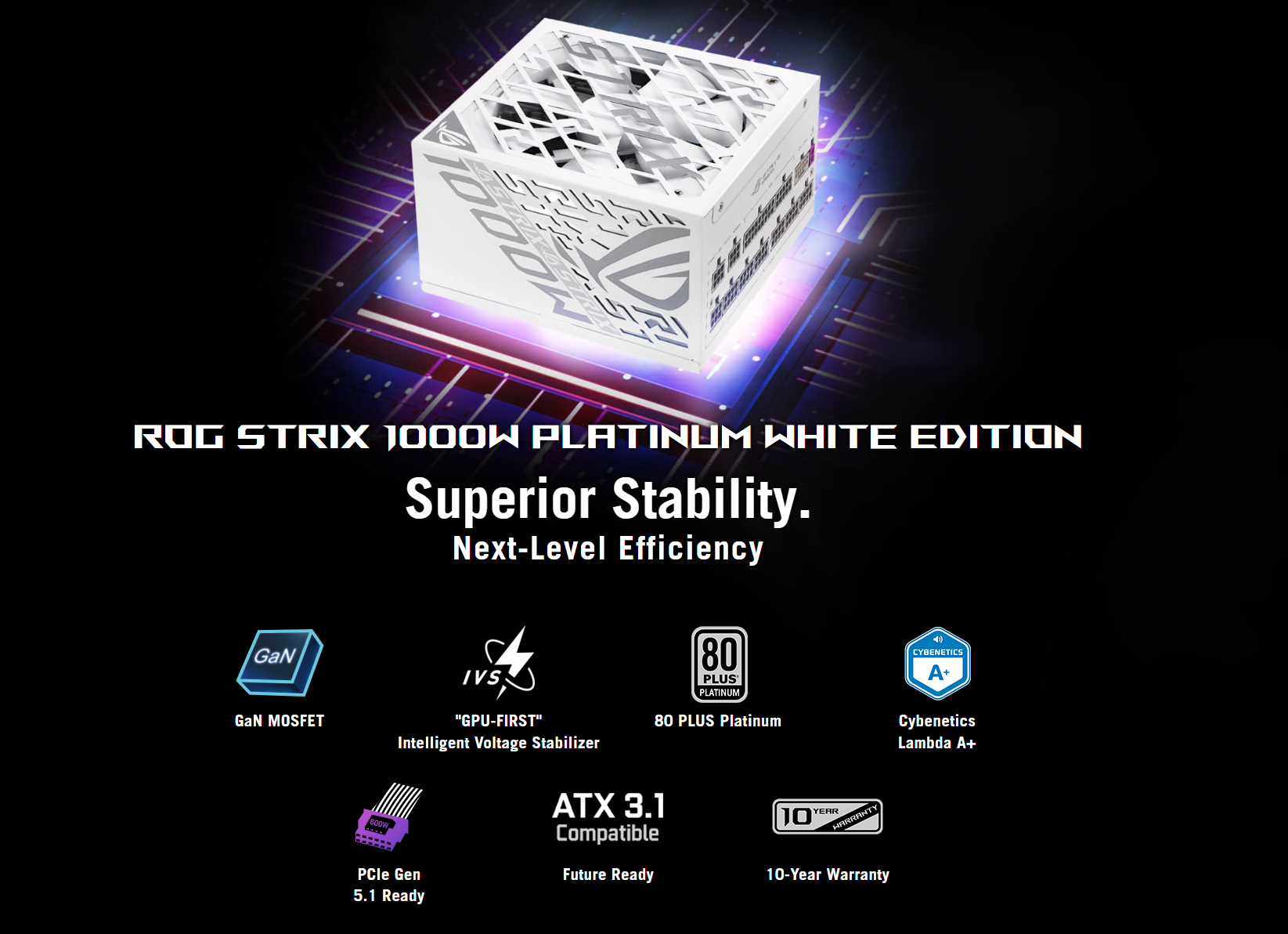 The ROG Strix Platinum White Edition PSU delivers the top-tier performance and unwavering stability demanded by gamers. Featuring next-gen GaN MOSFET for superior power efficiency. The “GPU-FIRST” voltage sensing with patented-intelligent voltage stabilizer ensures a steady flow of power to the graphics card. Plus, it is ready for latest hardwares with ATX 3.1 compliance and a native 12V-2x6 connector. The ROG Strix Platinum Series ensures your high-end rig has the power to conquer any challenge.