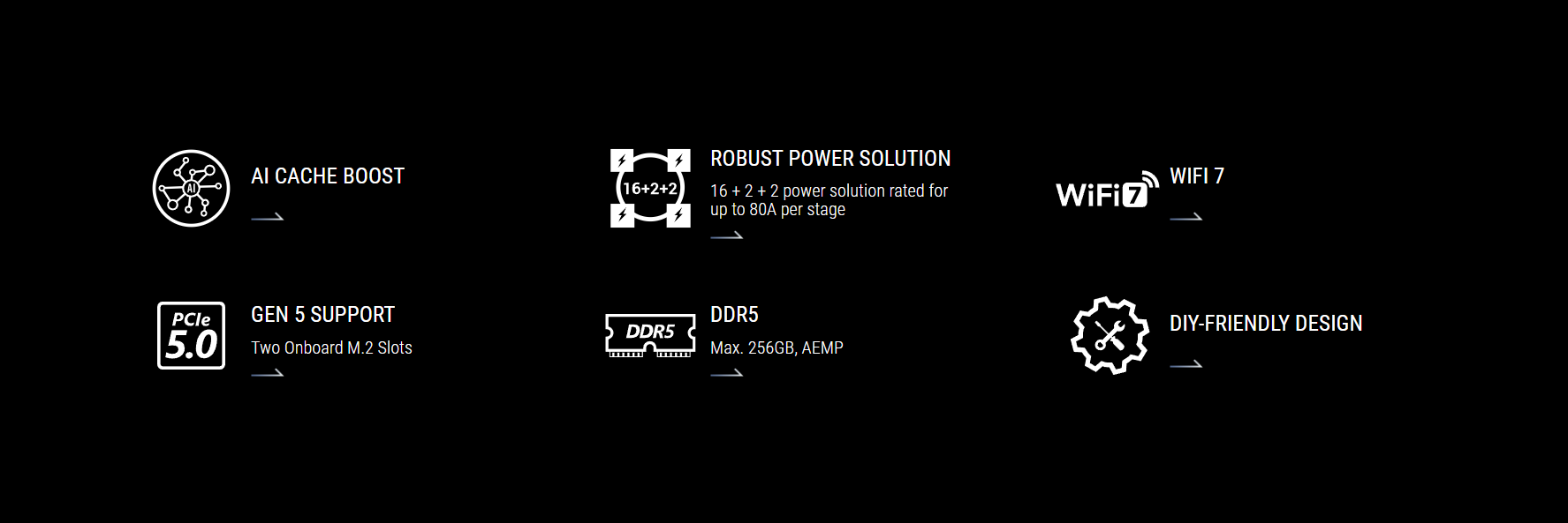 | Wireless & Bluetooth | Wi-Fi 7* 2x2 Wi-Fi 7 (802.11be) Supports 2.4/5/6GHz frequency band** Supports Wi-Fi 7 160MHz bandwidth, up to 2.9Gbps transfer rate. Bluetooth v5.4*** *Wi-Fi features may vary depending on the operating system For Windows 11, Wi-Fi 7 will require 24H2 or later version for full functions, Windows 11 21H2/22H2/23H2 only supports Wi-Fi 6E. For Windows 10, please note that no driver is available, refer to the Wi-Fi chipset vendor's website for details. ** Wi-Fi 6GHz frequency band and bandwidth regulatory may vary between countries. *** The Bluetooth version may vary, please refer to the Wi-Fi module manufacturer's website for the latest specifications. |