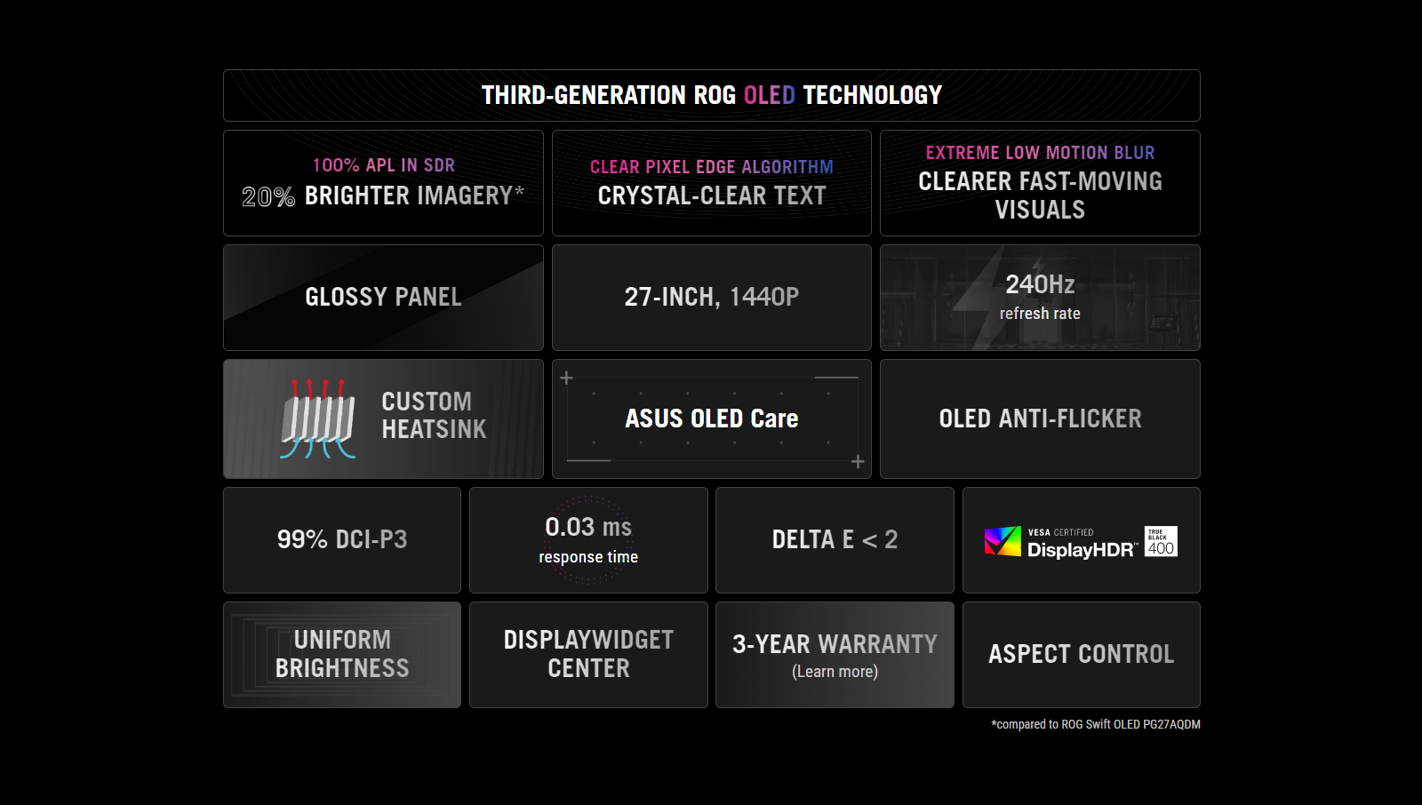 ROG Strix OLED XG27AQDMG gaming monitor ― 27-inch (26.5-inch viewable) 1440p glossy WOLED panel, 240 Hz, 0.03 ms, custom heatsink,