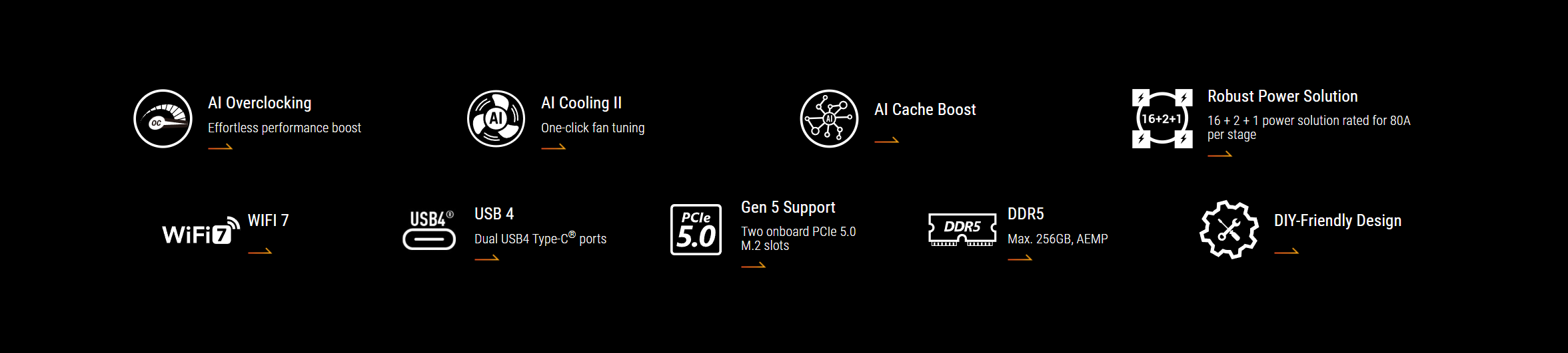 | Expansion Slots | AMD Ryzen 9000 & 7000 Series Desktop Processors* 1 x PCIe 5.0 x16 slot (supports x16 mode) AMD Ryzen 8000 Series Desktop Processors* 1 x PCIe 4.0 x16 slot (supports x8/x4 mode)** AMD X870E Chipset 1 x PCIe 4.0 x16 slot (supports x4 mode) * Please check the PCIe bifurcation table on the support site (https://www.asus.com/support/FAQ/1037507/). ** Specifications vary by CPU types. - To ensure compatibility of the device installed, please refer to https://www.asus.com/support/download-center/ for the list of supported peripherals. |
