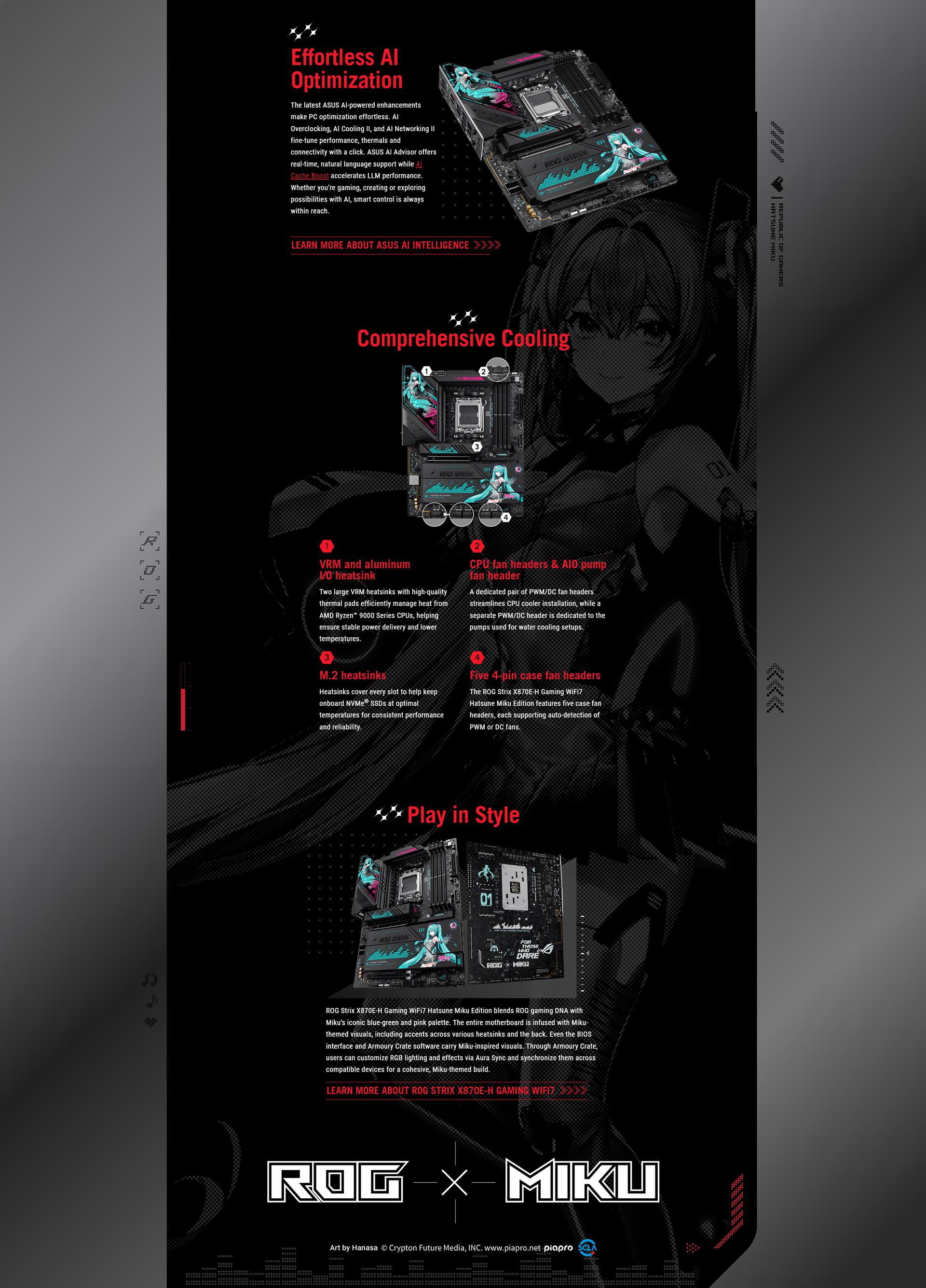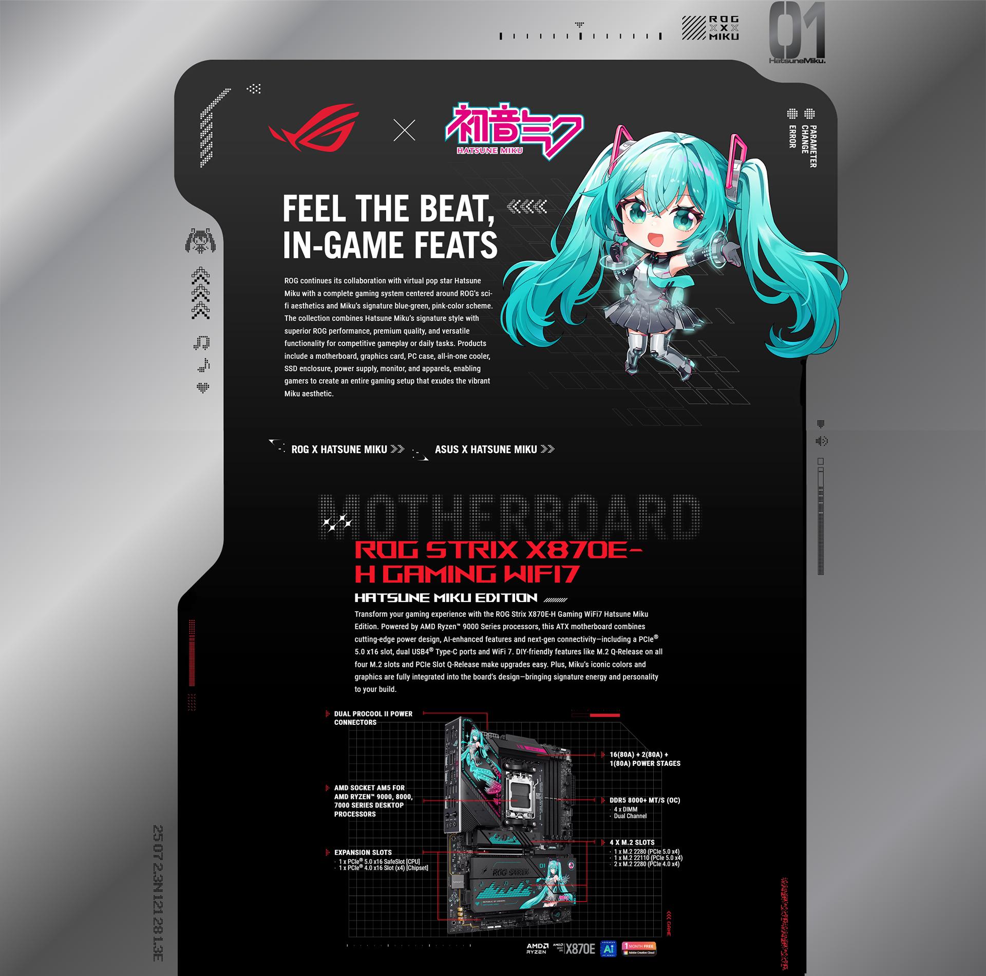| Accessories | Cables 2 x SATA 6Gb/s cables Miscellaneous 1 x ASUS WiFi Q-Antenna 1 x Cable ties package 1 x M.2 Q-Latch package 1 x ASUS PCIe to Front USB Card (supports 2 x USB 5Gbps Type-A + 1 x USB 10Gbps Type-C ports) 1 x PHONE STAND HATSUNE MIKU EDITION 1 x THANK YOU CARD HATSUNE MIKU EDITION 1 x STICKER HATSUNE MIKU EDITION 4 x M.2 rubbers Documentation 1 x Quick start guide |