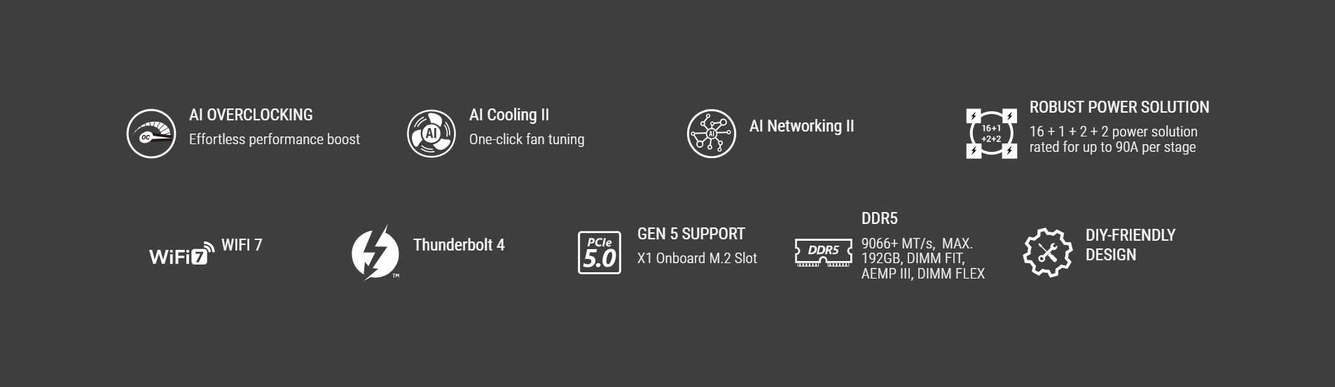 | Wireless & Bluetooth | Wi-Fi 7* 2x2 Wi-Fi 7 (802.11be) Supports 2.4/5/6GHz frequency band** Supports Wi-Fi 7 320MHz bandwidth, up to 5.8Gbps transfer rate. Bluetooth v5.4*** *Wi-Fi features may vary depending on the operating system For Windows 11, Wi-Fi 7 will require 24H2 or later version for full functions, Windows 11 21H2/22H2/23H2 only supports Wi-Fi 6E. For Windows 10, only Wi-Fi 6 is supported. ** Wi-Fi 6GHz frequency band and bandwidth regulatory may vary between countries. *** The Bluetooth version may vary, please refer to the Wi-Fi module manufacturer's website for the latest specifications. |