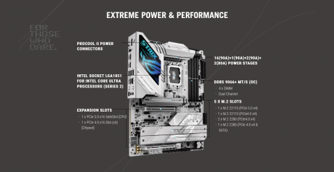 | Memory | 4 x DIMM slots, max. 192GB, DDR5 Support up to 9066+MT/s (OC), Non-ECC, Un-buffered ,Clocked Unbuffered DIMM (CUDIMM)* Dual channel memory architecture Supports Intel Extreme Memory Profile (XMP) memory module Supports DIMM Flex Supports DIMM FIT ASUS Enhanced Memory Profile III (AEMPIII) * Supported memory types, data rate (speed), and number of DRAM modules vary depending on the CPU and memory configuration, for more information please refer to CPU/Memory Support list under the Support tab of product information site or visit https://www.asus.com/support/download-center/. * Non-ECC, un-buffered DDR5 memory supports On-Die ECC function. |