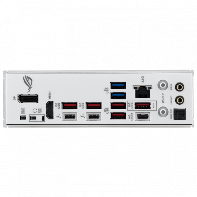 | Back Panel I/O Ports | 2 x Thunderbolt 4 ports (2 x USB Type-C)* 6 x USB 10Gbps ports (5 x Type-A + 1 x USB Type-C with up to 30W PD/PPD Fast-charge) 2 x USB 5Gbps ports (2 x Type-A) 1 x DisplayPort 1 x HDMI port 1 x Wi-Fi module 1 x Intel 2.5Gb Ethernet port 2 x Audio jacks 1 x Optical S/PDIF out port 1 x BIOS FlashBack button 1 x Clear CMOS button |