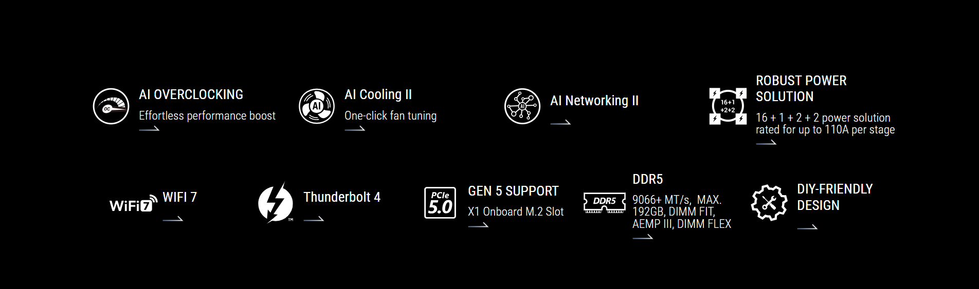 | Wireless & Bluetooth | Wi-Fi 7* 2x2 Wi-Fi 7 (802.11be) Supports 2.4/5/6GHz frequency band** Supports Wi-Fi 7 320MHz bandwidth, up to 5.8Gbps transfer rate. Bluetooth v5.4*** *Wi-Fi features may vary depending on the operating system For Windows 11, Wi-Fi 7 will require 24H2 or later version for full functions, Windows 11 21H2/22H2/23H2 only supports Wi-Fi 6E. For Windows 10, only Wi-Fi 6 is supported. ** Wi-Fi 6GHz frequency band and bandwidth regulatory may vary between countries. *** The Bluetooth version may vary, please refer to the Wi-Fi module manufacturer's website for the latest specifications. |