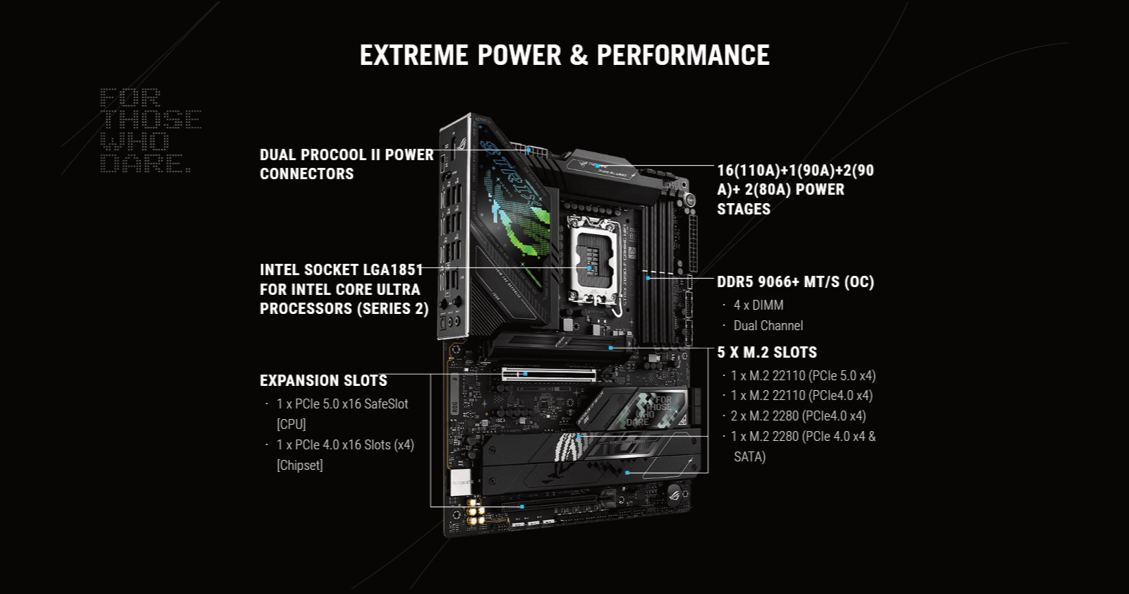 | Software Features | ROG Exclusive Software - ROG CPU-Z - Dolby Atmos ASUS Exclusive Software Armoury Crate - AIDA64 Extreme (60 days free trial) - Aura Creator - Aura Sync - Fan Xpert 4 (with AI Cooling II) - GameFirst - HWiNFO - Power Saving ASUS Driver Hub ASUS GlideX TurboV Core USB Wattage Watcher Adobe Creative Cloud (Free Trial) Norton 360 for Gamers (60 Days Free Trial) WinRAR (40 Days Free Trial) UEFI BIOS AI Overclocking Guide ASUS EZ DIY - ASUS CrashFree BIOS 3 - ASUS EZ Flash - ASUS UEFI BIOS EZ Mode - ASUS MyHotkey NPU Boost FlexKey |