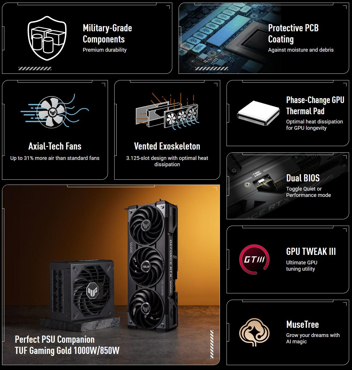 12GB GDDR7 | Software | ASUS GPU Tweak III & MuseTree & GeForce Game Ready Driver & Studio Driver: please download all software from the support site. |