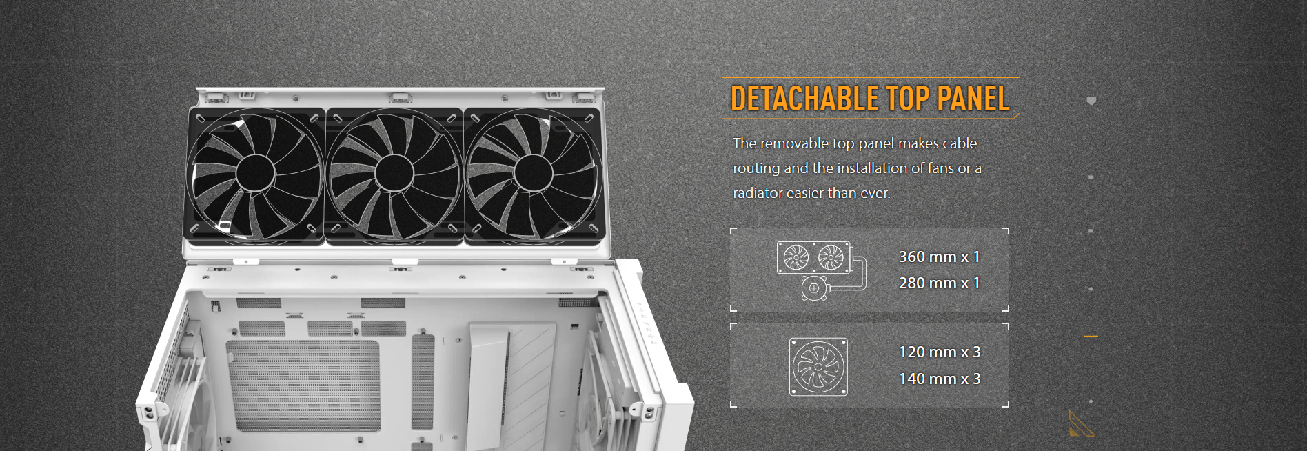 | Cooling Support (Front) | 3 x 140 mm |