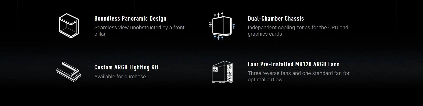- ARGB осветление: Включва четири предварително инсталирани ARGB вентилатора и поддържа допълнителни комплекти за персонализирано ARGB осветление.