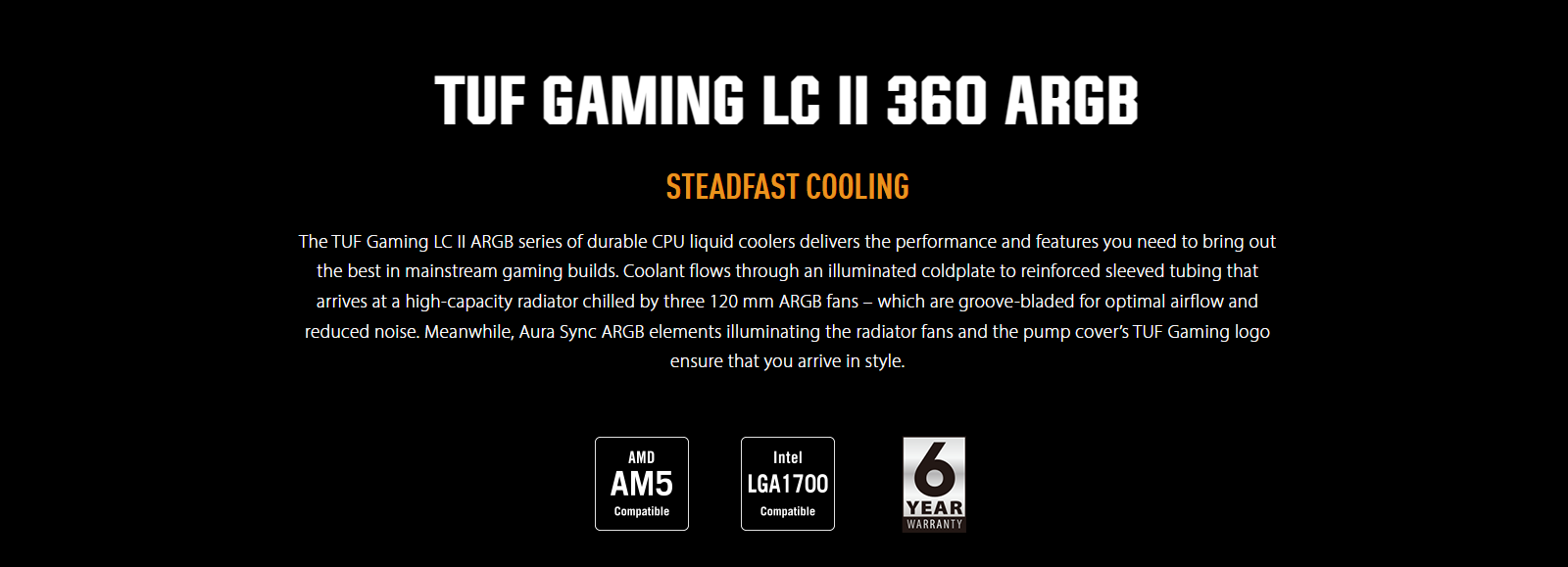 | Note | TUF GAMING LC Series *Before purchasing TUF GAMING LC II 360 ARGB AIO cooler products, please ensure your motherboard has 3-pin ARGB header(s) to connect ARGB cable on AIO Cooler and bundled ARGB FAN(s). |