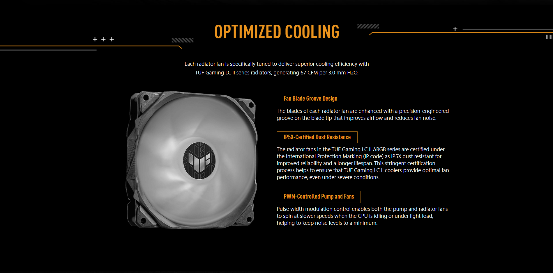 | Fan | Fan:TUF GAMING FAN MODEL 12 ARGB - Size: 3 x Fan Slots (120mm) - Dimension:120 x 120 x 25 mm - Speed: 800 - 2000 RPM +/- 10% - Static Pressure:3.0 mmH2O - Air Flow: 67 CFM / 113.8 m3h - Noise: 29 dB(A) - Control Mode: PWM/ DC |