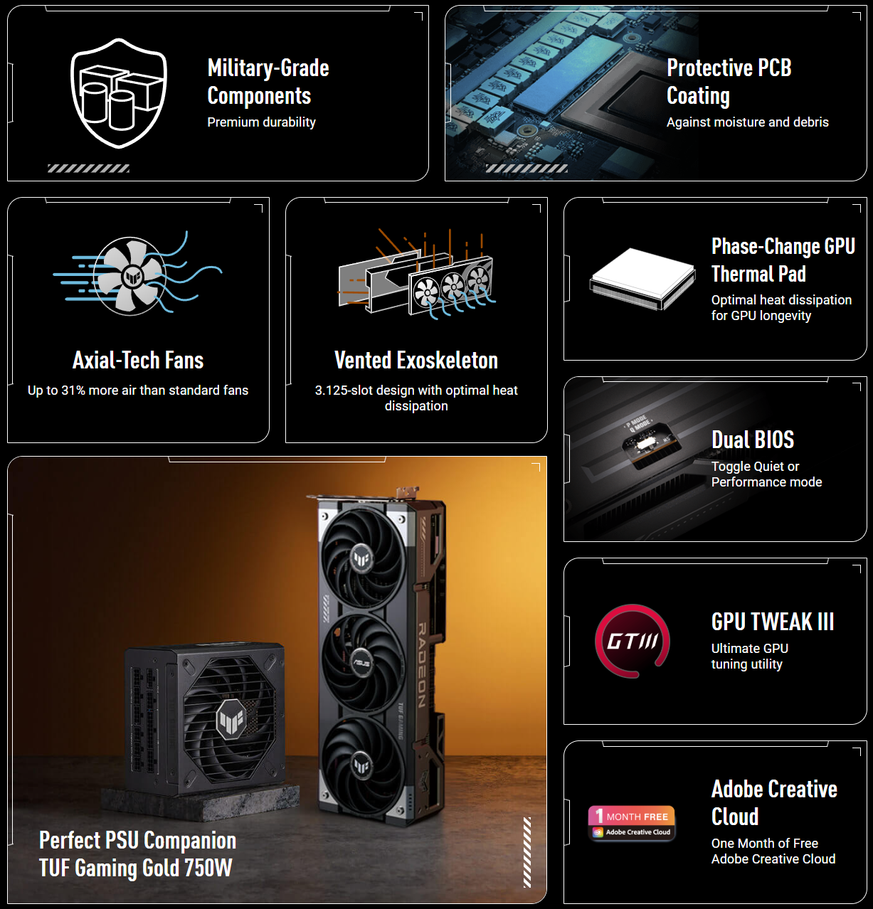 | Bus Standard | PCI Express 5.0 | Accessories | 1 x TUF certificate of Reliability 1 x TUF Gaming Graphics Card Holder 1 x TUF Velcro Hook & Loop 1 x TUF Fridge Magnet 1 x Thank you card 1 x Speedsetup Manual |