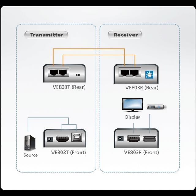 VE803 освен това предава през мрежовия кабел и USB сигнали, позволявайки да поставите всякакви USB устройства между применика и предавателя. USB удължението поддържа също така контрол през сензорен екран позволявайки да управлявате локалното HDMI устройство източник от отдалечения дисплей - или обратно.