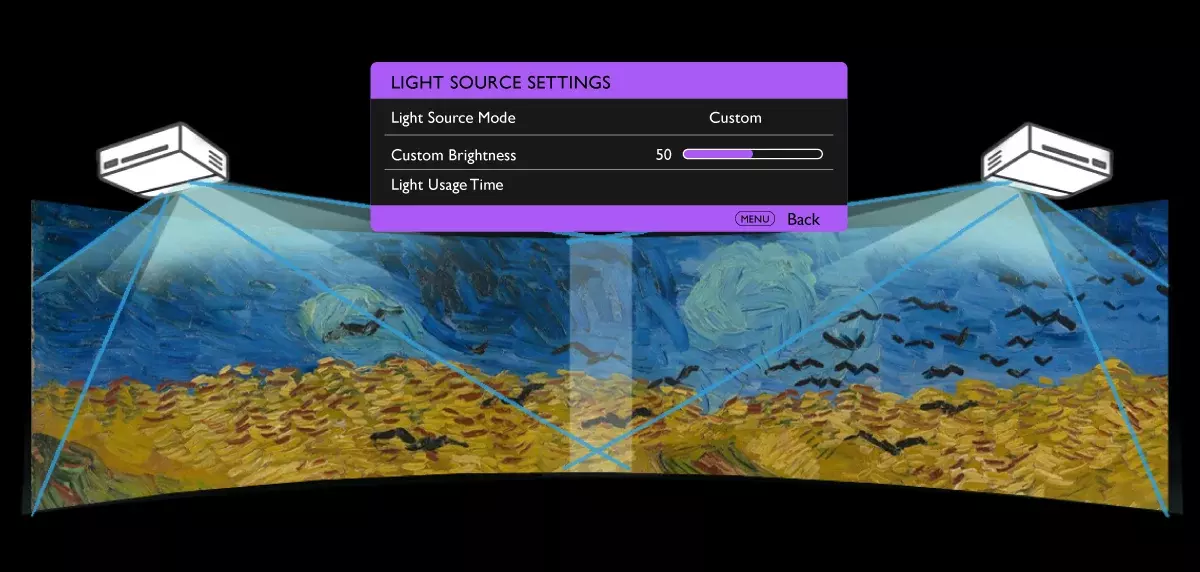 Custom Light Mode modulates light power output from 40% to 100% under a scale of 80 steps, optimizing the projected image in a variety of ambient