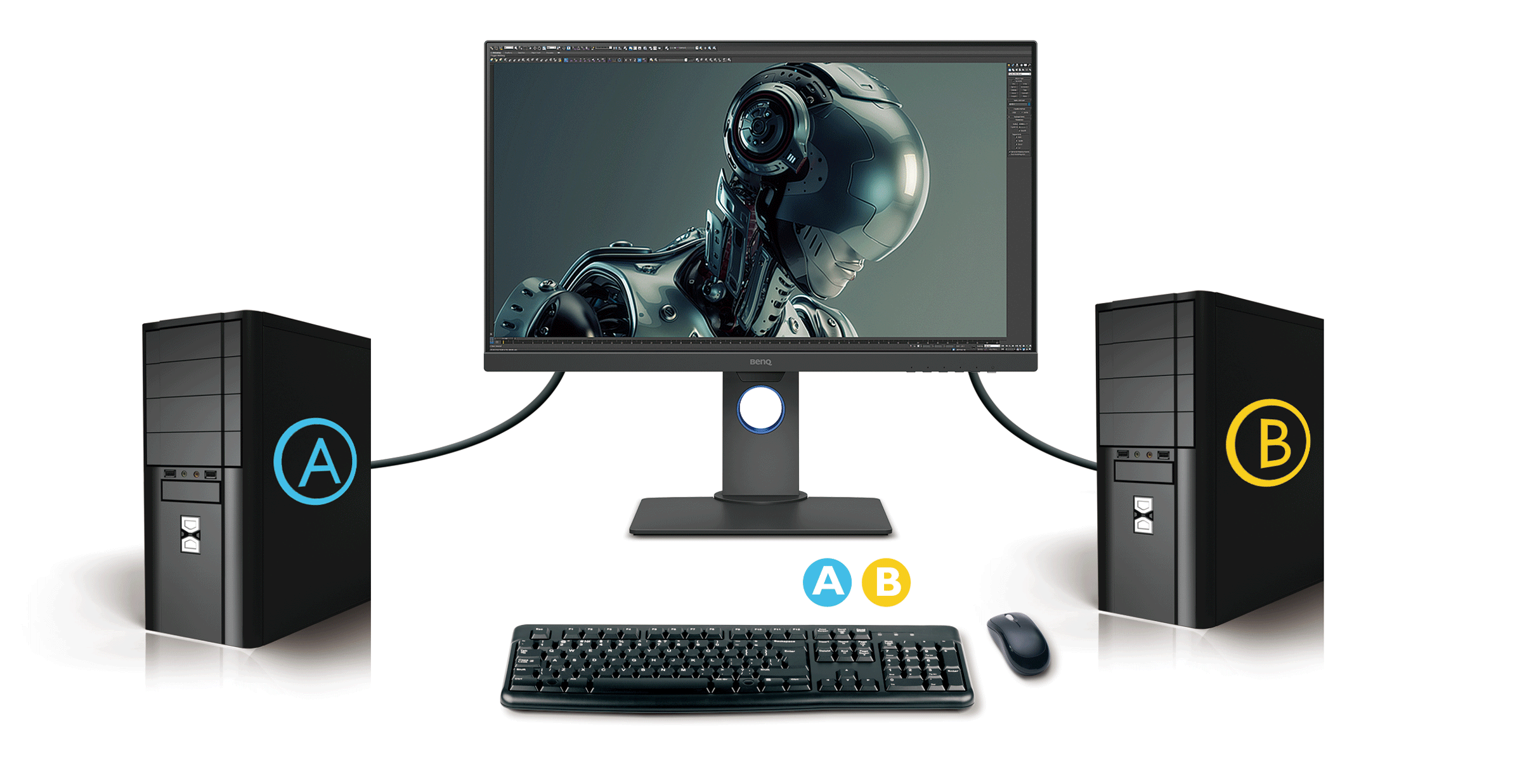 KVM Switch function allows users to display and control content from two different PC systems on one screen using just one set of keyboard and mouse to save space and boost work efficiency.