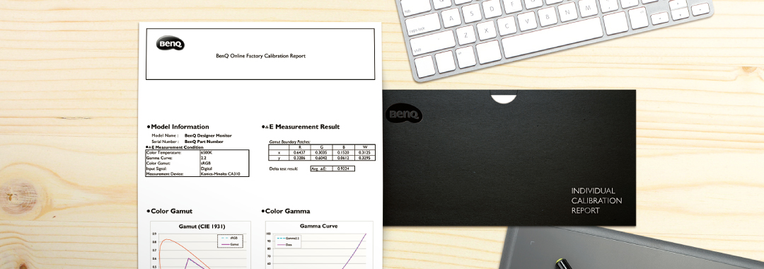 Each BenQ Designer Monitor is individually factory-calibrated upon production to assure precise Delta-E and Gamma performance. Calibration results are validated against industry color standards to deliver the truest and most representative view of original content.