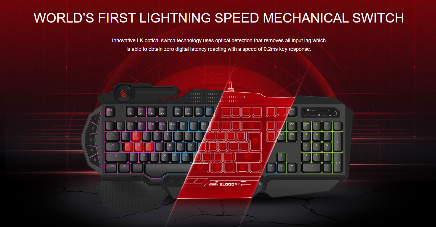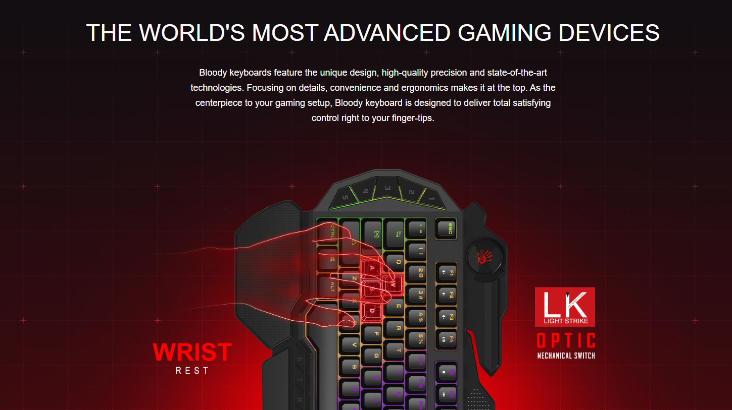 Bloody B314 е механична клавиатура с подсветка генерираща над 16 милиона цвята. Суичовете ѝ са базирани на нова инфрачервена технология от Bloody, която превръща всеки бутон в най- бързия на света с време за реакция под 0.2 мили секунди. Bloody B314 притежава странични 9 макро бутони, които са 100% програмируеми. Space -а е подсилен с две пружини и балансиращи елементи, които гарантират доста по-продължителен живот и издръжливост на копчето. WASD бутоните са покрити със силикон, който гарантира уникален комфорт и издръжливост, но не това е специалното именно на тези 4 клавиша.