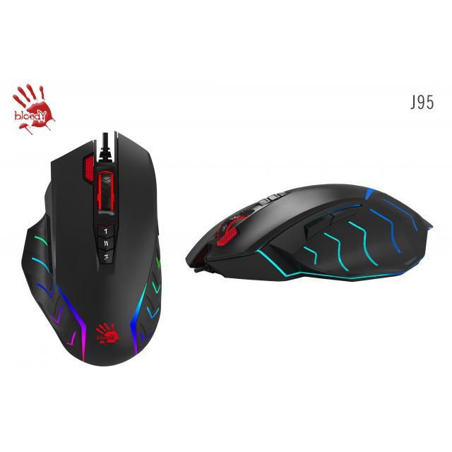 Bloody J95s е геймърска оптична мишка с до 8000 CPI и стандартен USB накрайник. Кабелът е плетен, гарантиращ максимална здравина и решава проблемът оплитане. Чрез софтуера на Bloody ще можете да настроите абсолютно всичко на вашата мишка. Оптичниият сензор предлага възможност за смяна на CPI в пет стъпки, като започва от 100 и стига до 8000, но със софтуерът на Bloody ще можете да персонализирате и това. Ще може да програмирате всеки един бутон на мишката, а RGB подсветката е разделена на 15 зони, като всяка e с индивидуална настройка, а имате и 5 фабрично заредени ефекта. С тази мишка ще вдигнете нивото на игралното поле и ще бъдете истинско страшилище за враговете.