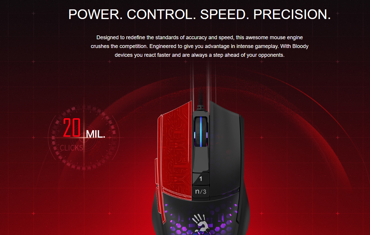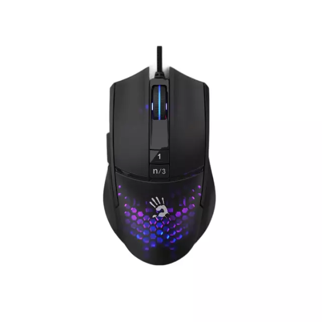 | Features a solid yet light honeycomb inner shell that reduces the mouse's weight to just 78 grams. With translucent upper cover for RGB backlit performance meanwhile ensures dust and dirt resistance. | With professional 12,000 CPI, 8000 FPS,250 IPS, and 35G acceleration, the mouse gives gamers accurate and precise on-screen control in fast paced FPS games such as CS:GO. | 5 Types of lighting effects are preloaded by default. You can change the other backlit colors through bloody software. |