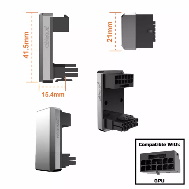 Once plugged in, our 12VHPWR 90 Degree Adapter measures 21mm from the connector to the outer shell, which means increased space and more clearance between your GPU and your side panel. For even tighter spaces, our 180 Degree achieves a thin 15.4mm. This enables installation of super wide cards in more narrow chassis.
