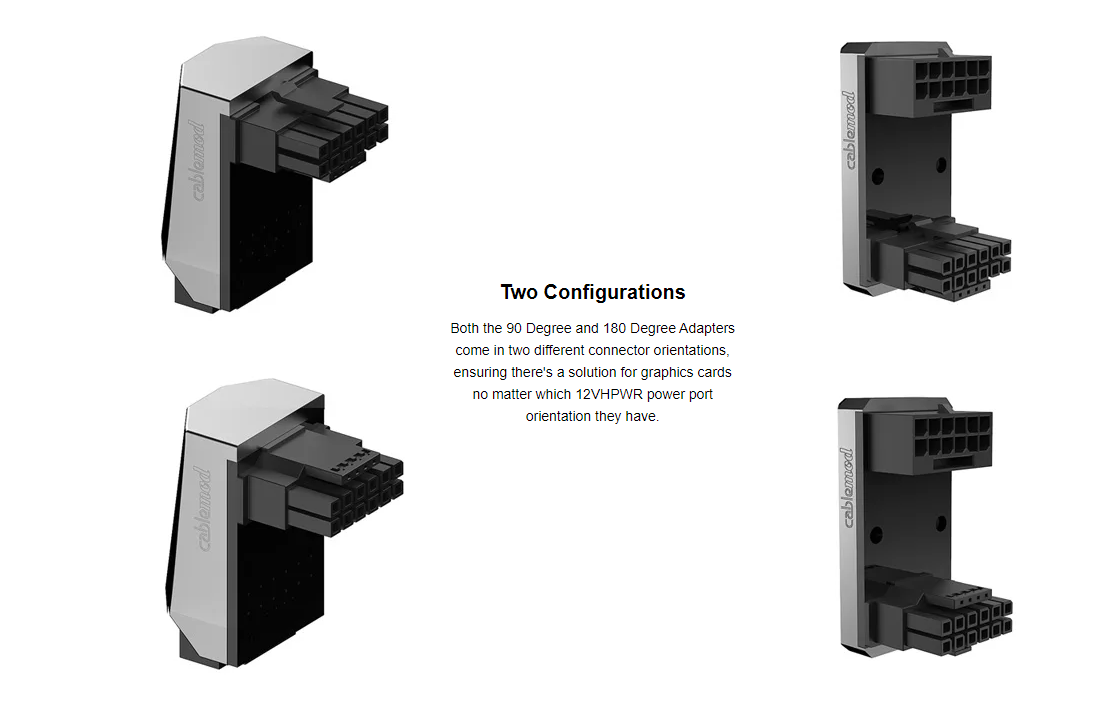 Achieve cable management nirvana with CableMod 12VHPWR Angled Adapters These low profile adapters plug into your graphic card’s 16-pin 12VHPWR port, and enables the power cable to be plugged in at either 90 degree or 180 degree angles. Featuring a multi-PCB design and a sleek profile, this adapter helps increase clearance between the GPU and the side panel – perfect for today’s super wide GPUs.