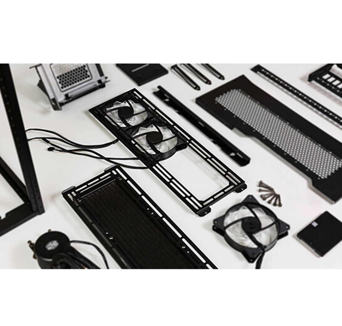 A flat radiator bracket design offers more versatility for liquid cooling with the ability to be mounted on the top, front, or bottom of the frame. The two included brackets can each support a 420mm radiator, with the ability to mount fans and a radiator on either side of the bracket.