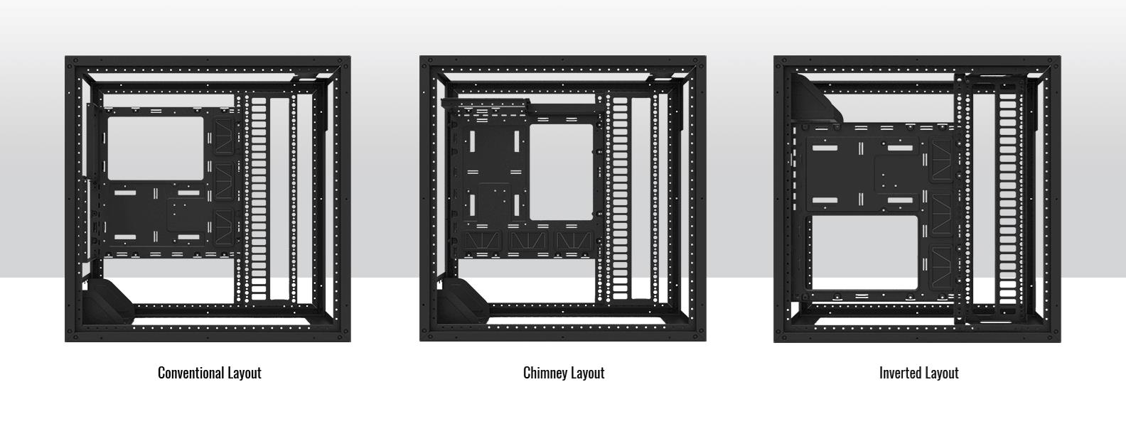 Highly Versatile Layout – The unique frame design supports a conventional, chimney, inverse layout, or a fully customized layout. The motherboard tray is also removable for installation outside of the chassis.