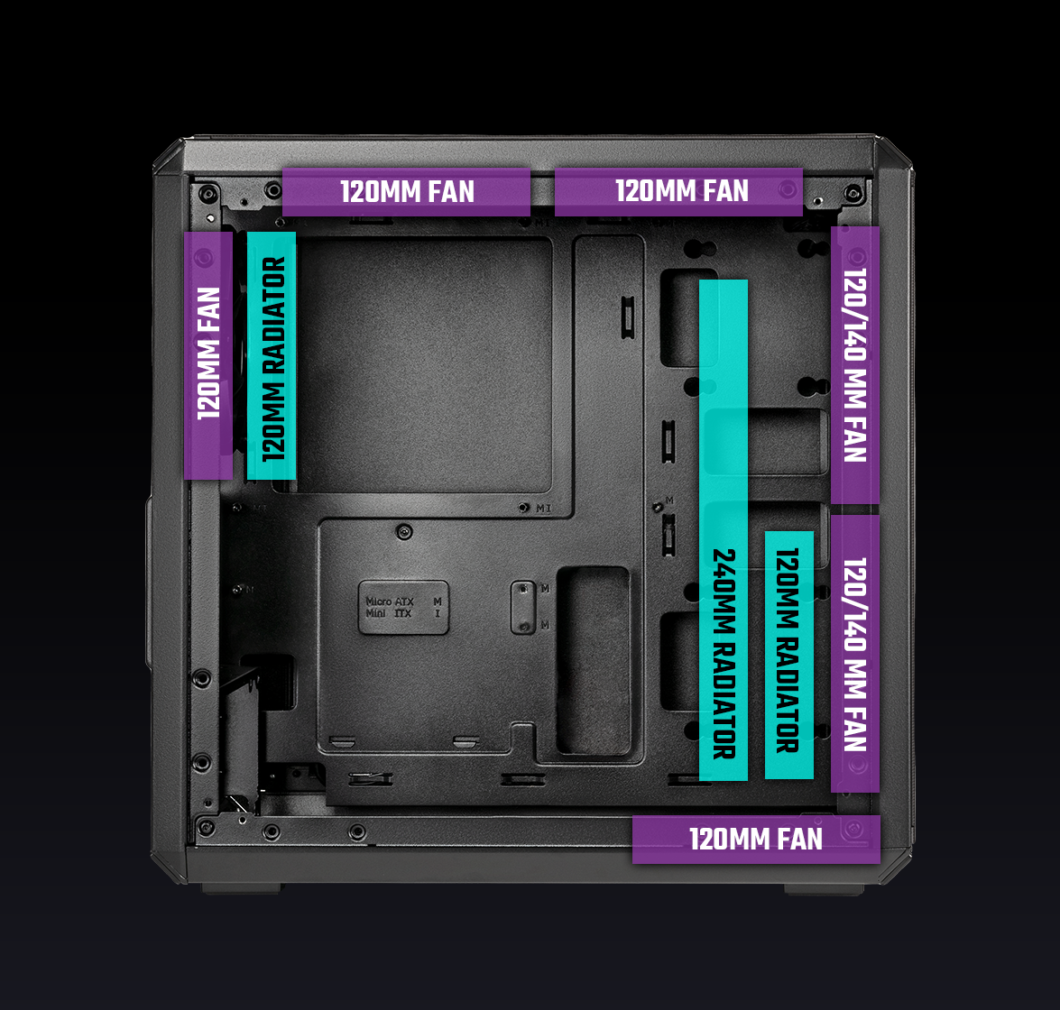 The front supports up to two 140mm fans and up to a 240mm radiator.