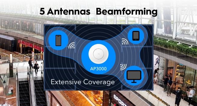 Five antennas plus 3+2 structure create more paths to bypass obstacles. Beamforming tracks connected devices' directions and boosts signal towards them.