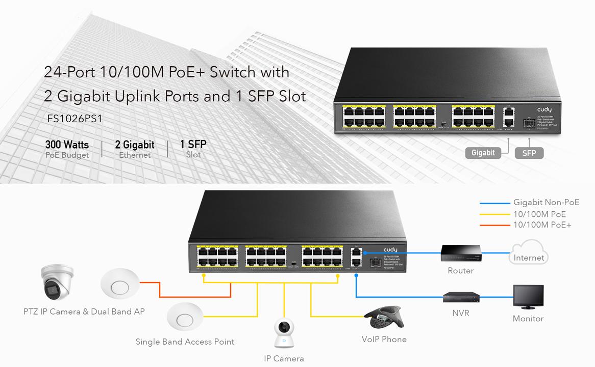24-Port 10/100M PoE+ Switch with 2 Gigabit Uplink Ports and 1 SFP Slot | ||