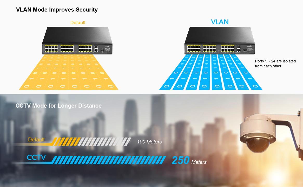 Supports a total PoE power of 300 W and up to 30 W for one PoE port. Non-standard PoE devices or normal PoE switches are not burned. Meets IEEE802.3af / at standard.